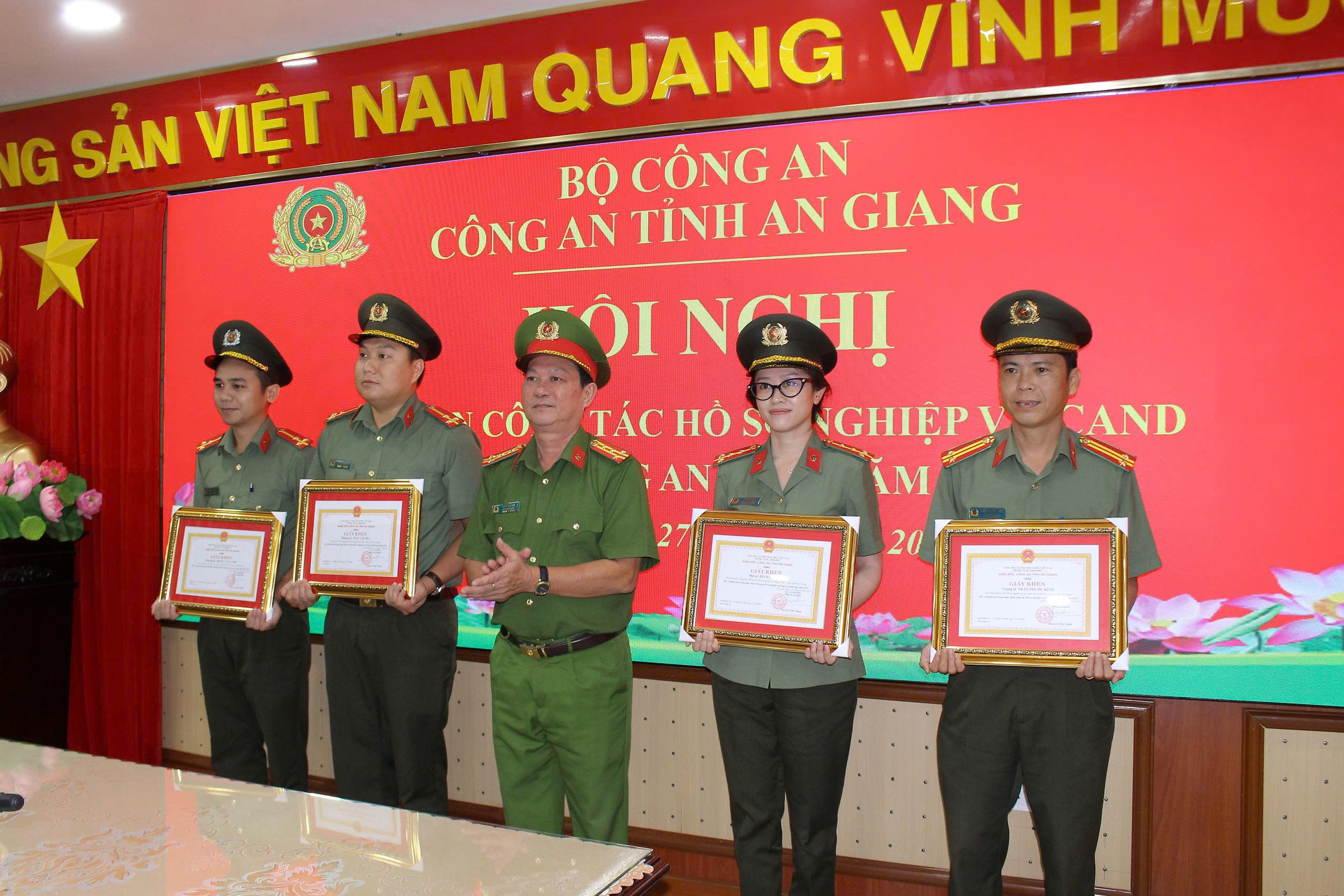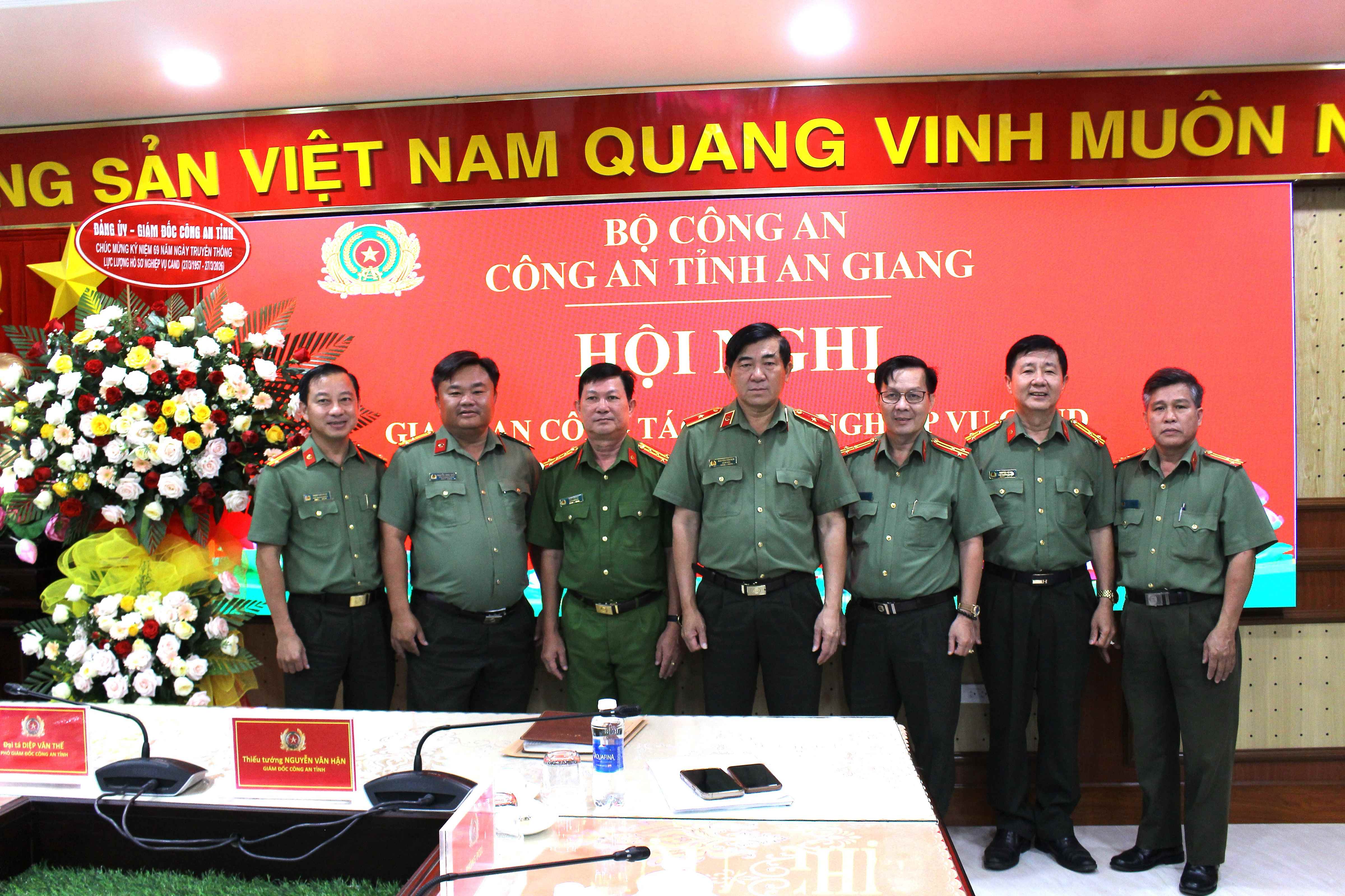 Chiều 27/3/2026, Công an tỉnh An Giang tổ chức Hội nghị giao ban công tác hồ sơ nghiệp vụ năm 2026. Dự và chỉ đạo hội nghị có Thiếu tướng Nguyễn Văn Hận - Ủy viên Ban Thường vụ Tỉnh ủy, Giám đốc Công an tỉnh; cùng dự có Đại tá Diệp Văn Thế - Phó Giám đốc Công an tỉnh. Hội nghị được tổ chức theo hình thức trực tiếp kết hợp trực tuyến đến điểm cầu Công an các xã, phường, đặc khu trên toàn tỉnh.