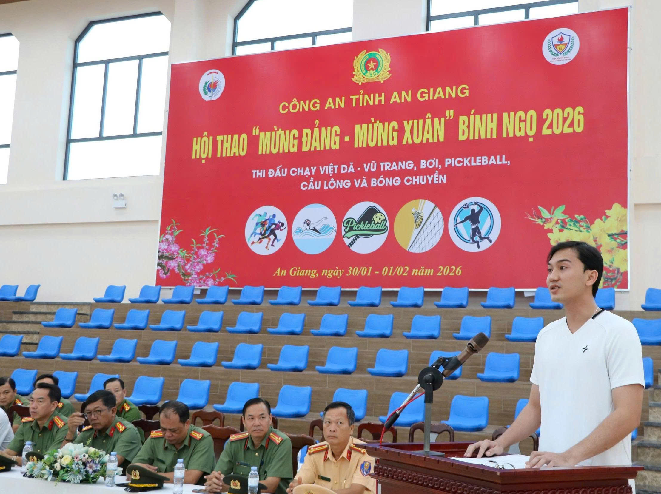 Phát biểu chỉ đạo tại lễ khai mạc, đồng chí Thiếu tướng Nguyễn Văn Hận, Giám đốc Công an tỉnh ghi nhận và biểu dương tinh thần trách nhiệm, sự chuẩn bị chu đáo của Ban Tổ chức; đồng thời khẳng định, hội thao không chỉ là sân chơi thể thao lành mạnh mà còn là dịp để lan tỏa phong trào rèn luyện thể lực trong toàn lực lượng. Đồng chí nhấn mạnh: “Mỗi cán bộ, chiến sĩ cần xem việc rèn luyện thể chất là yêu cầu thường xuyên, gắn chặt với quá trình công tác, chiến đấu; các vận động viên tham gia hội thao phải thi đấu với tinh thần đoàn kết, trung thực, cao thượng, bảo đảm an toàn tuyệt đối, qua đó thể hiện hình ảnh đẹp của người chiến sĩ Công an An Giang”.