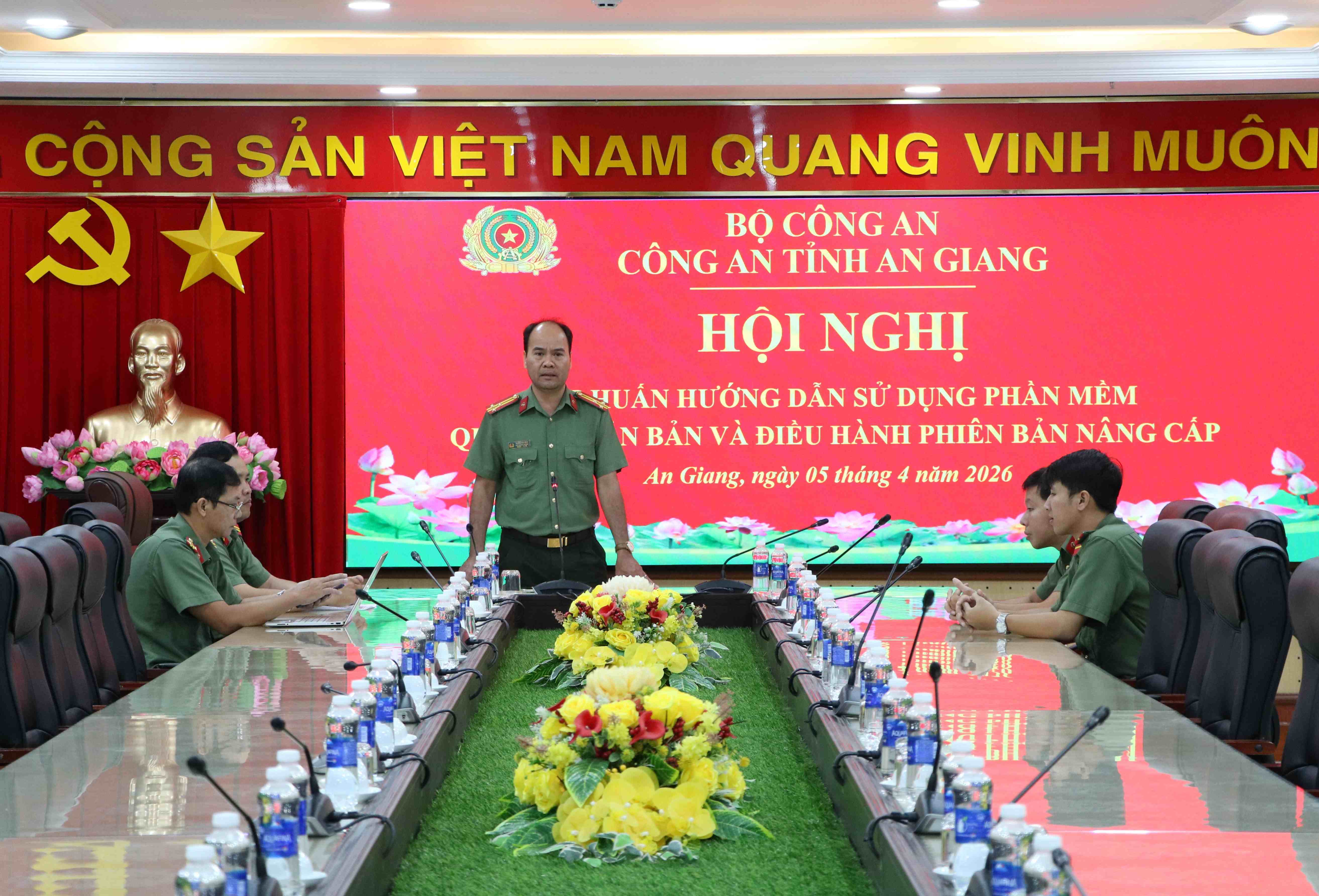 Ngày 5/4/2026, Công an tỉnh An Giang tổ chức Hội nghị tập huấn hướng dẫn sử dụng phần mềm quản lý văn bản và điều hành phiên bản nâng cấp. Hội nghị được tổ chức theo hình thức trực tuyến, kết nối đến Công an các xã, phường, đặc khu trên toàn tỉnh.