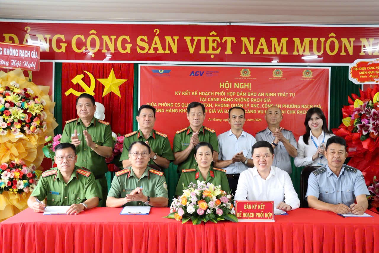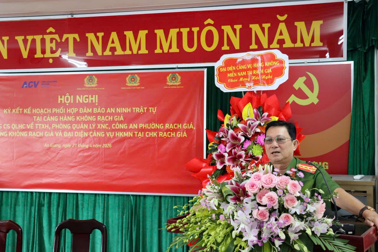 Ngày 21/4/2026, Công an tỉnh An Giang và Cảng hàng không Rạch Giá tổ chức hội nghị ký kết Kế hoạch phối hợp đảm bảo an ninh trật tự. Đồng chí Đại tá Diệp Văn Thế, Phó Giám đốc Công an tỉnh dự và chỉ đạo hội nghị.