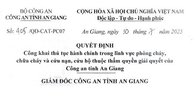 Quyết định số 405/QĐ-CAT-PC07 ngày 30/6/2025 của Công an tỉnh về việc công bố thủ tục hành chính trong lĩnh vực phòng cháy, chữa cháy và cứu nạn, cứu hộ thuộc phạm vi, chức năng quản lý nhà nước của Bộ Công an
