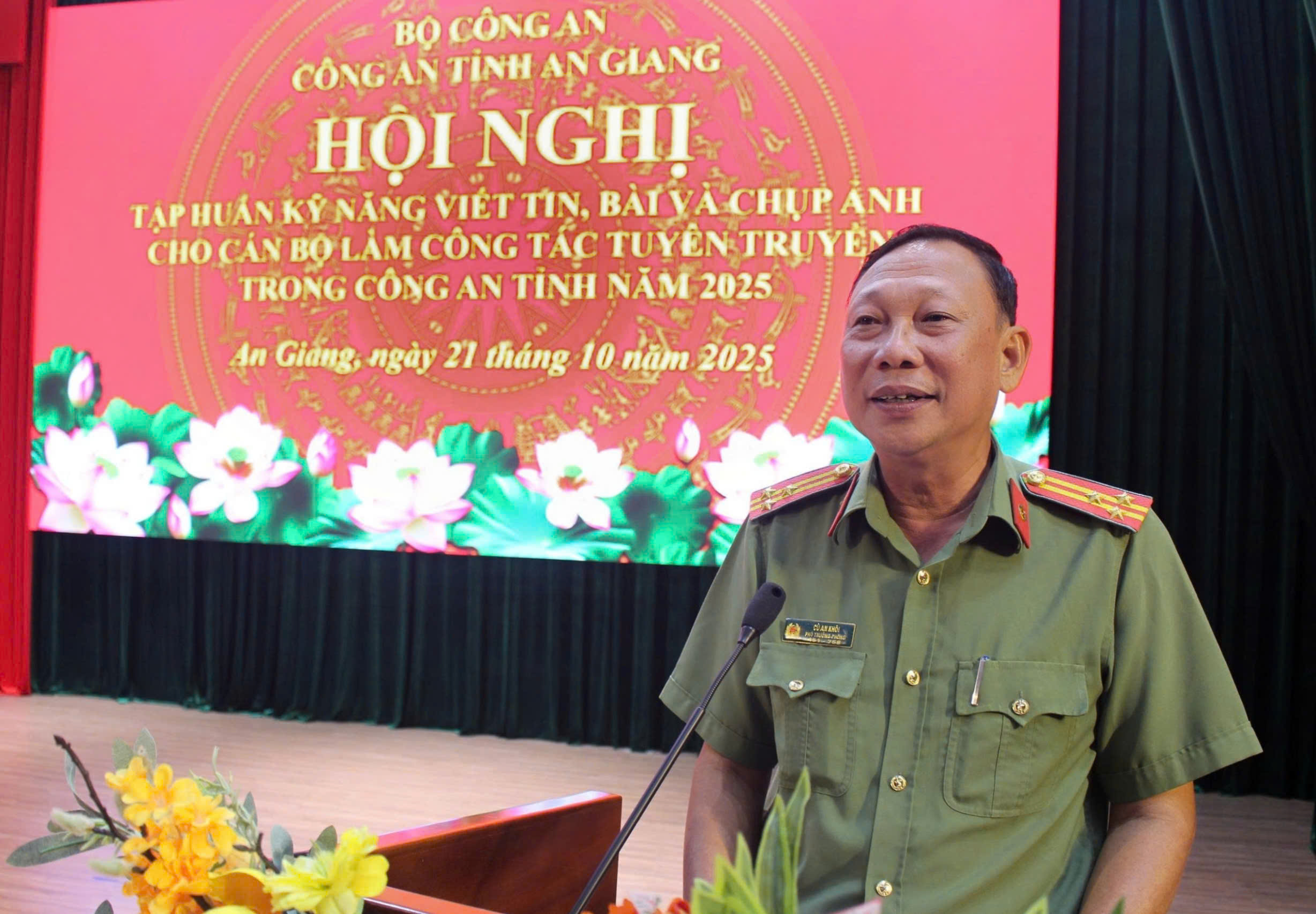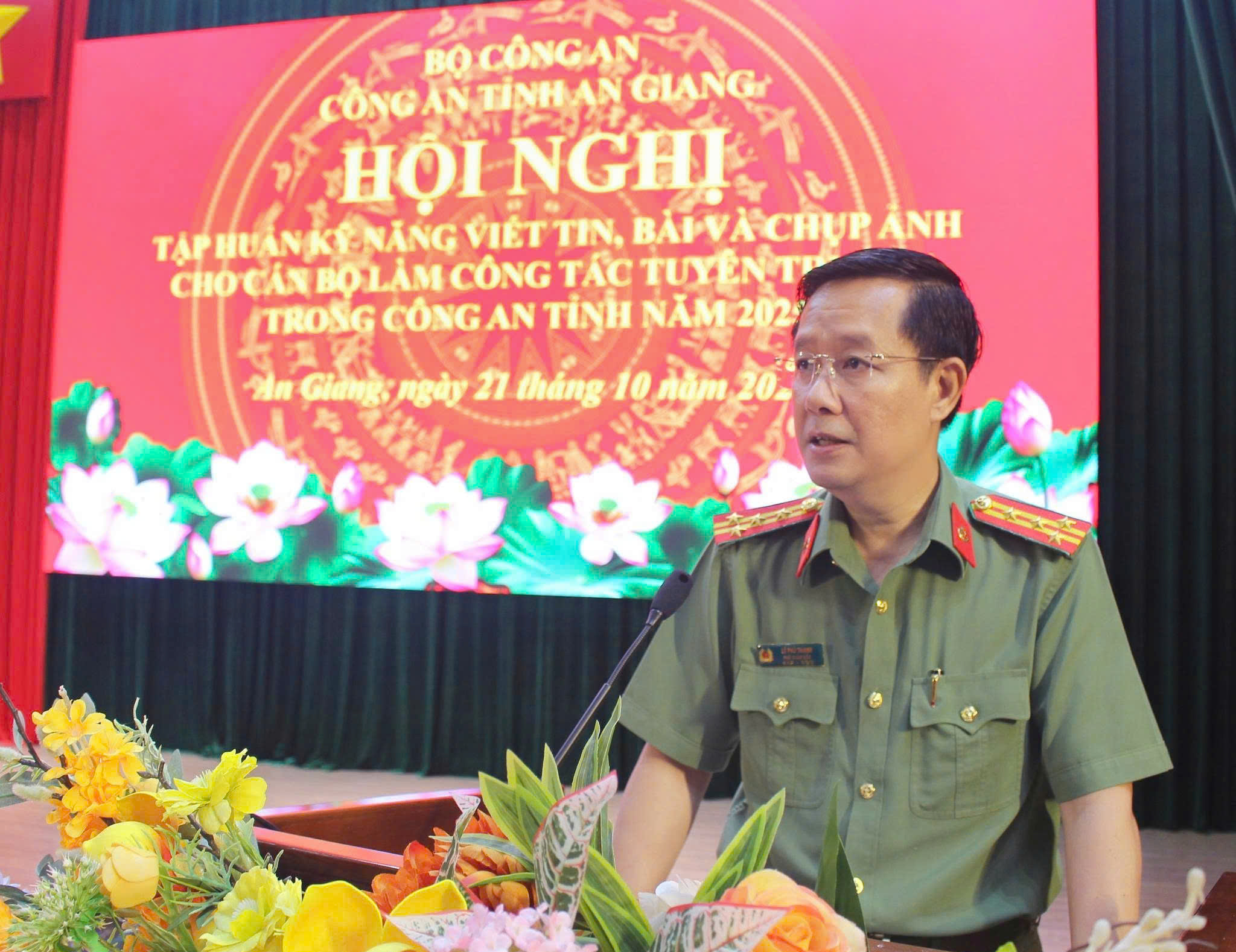 Sáng 21/10/2025, Công an tỉnh An Giang tổ chức Khai mạc hội nghị tập huấn kỹ năng viết tin, bài và chụp ảnh cho trên 260 cán bộ làm công tác tuyên truyền ở các phòng nghiệp vụ trực thuộc Công an tỉnh và Công an các xã, phường, đặc khu. Đại tá Lê Phú Thạnh, Tỉnh uỷ viên, Phó Bí thư Đảng ủy, Phó Giám đốc Công an tỉnh dự và phát biểu hội nghị.