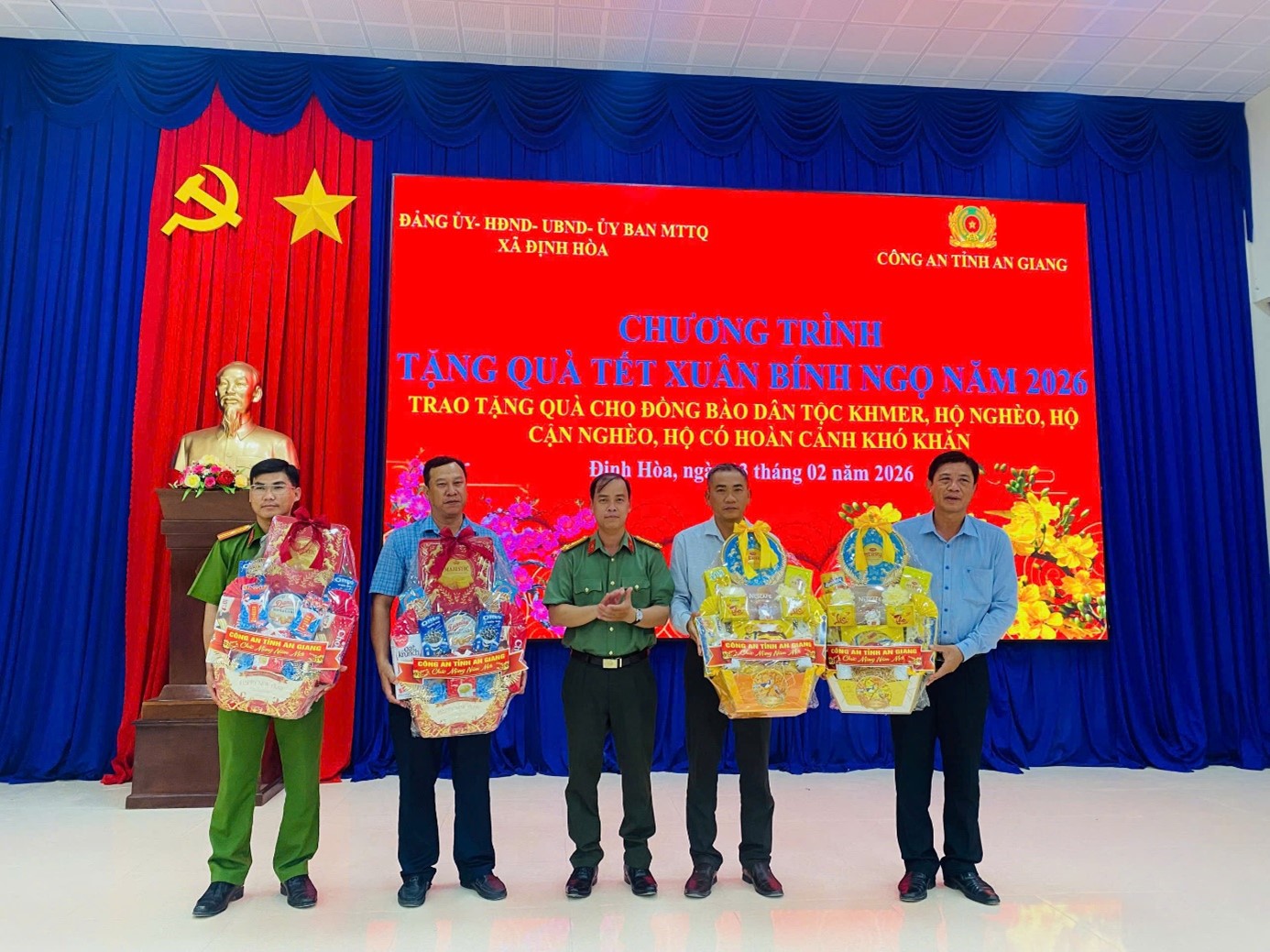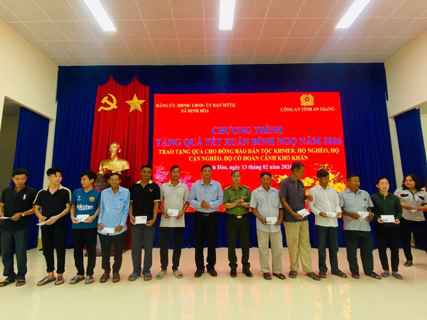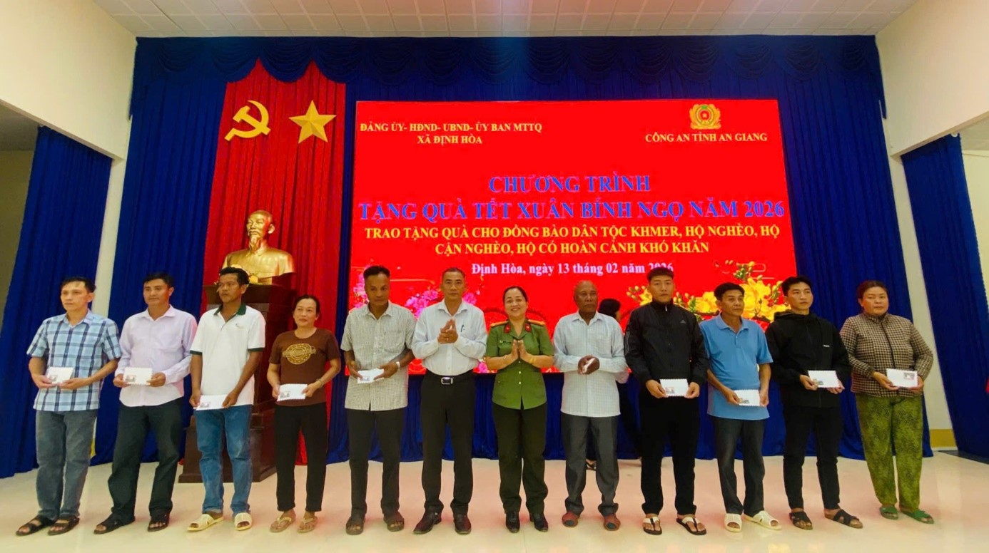 Thiết thực mừng Đảng, mừng Xuân Bính Ngọ năm 2026 và hưởng ứng phong trào thi đua “Ba nhất” do Bộ Công an đang phát động, Phòng An ninh kinh tế thừa ủy quyền của Giám đốc Công an tỉnh phối hợp với Đảng ủy, UBND xã Định Hòa tổ chức Chương trình trao quà Tết cho các gia đình chính sách và các hộ dân có hoàn cảnh khó khăn trong đồng bào dân tộc Khmer trên địa bàn xã.