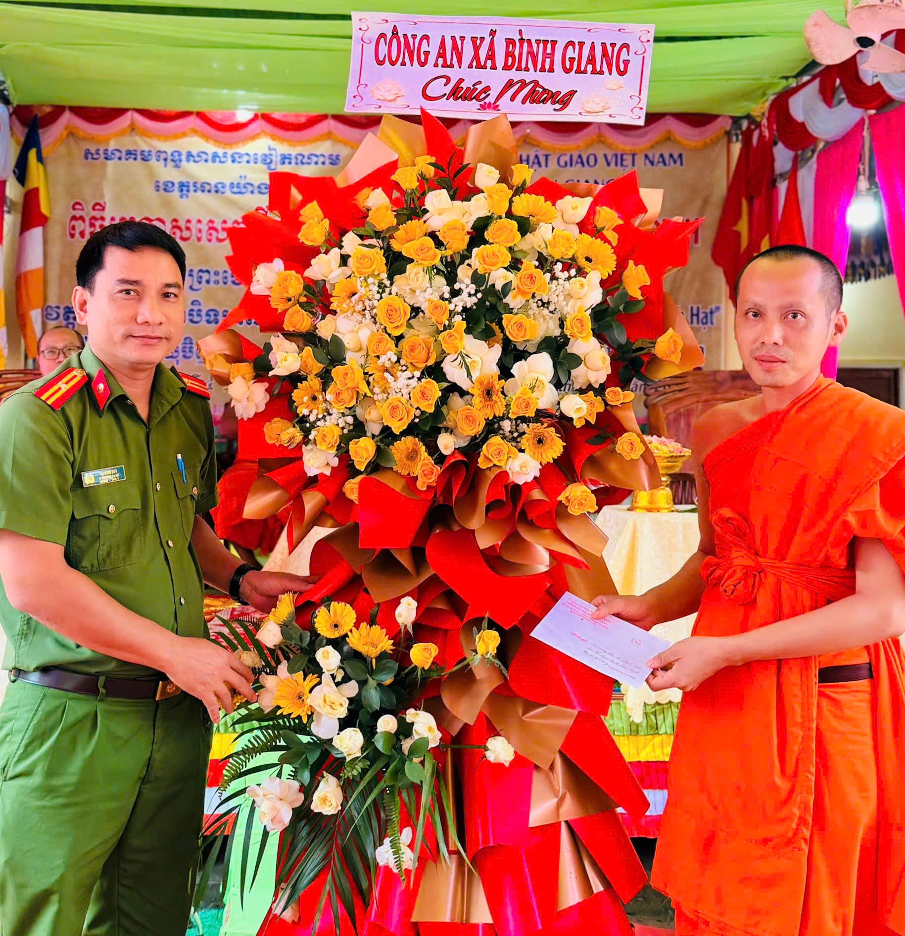 Đại diện Công an xã Bình Giang chúc mừng Đại đức Danh Tuấn - Trụ trì chùa Ranh Hạt