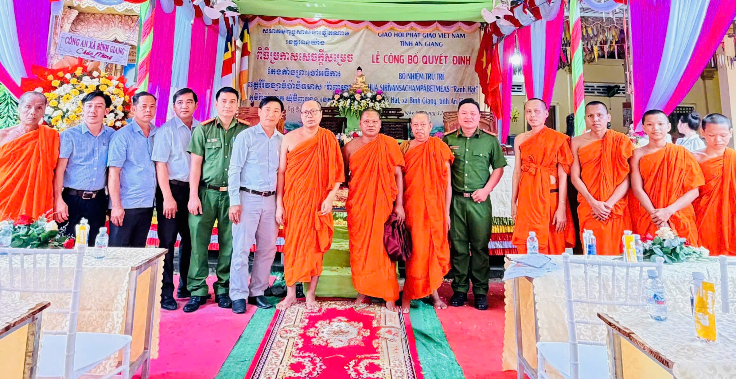 Công an xã Bình Giang chúc mừng chức sắc, phật tử đồng bào dân tộc Khmer nhân dịp bổ nhiệm Trụ trì chùa Ranh Hạt
