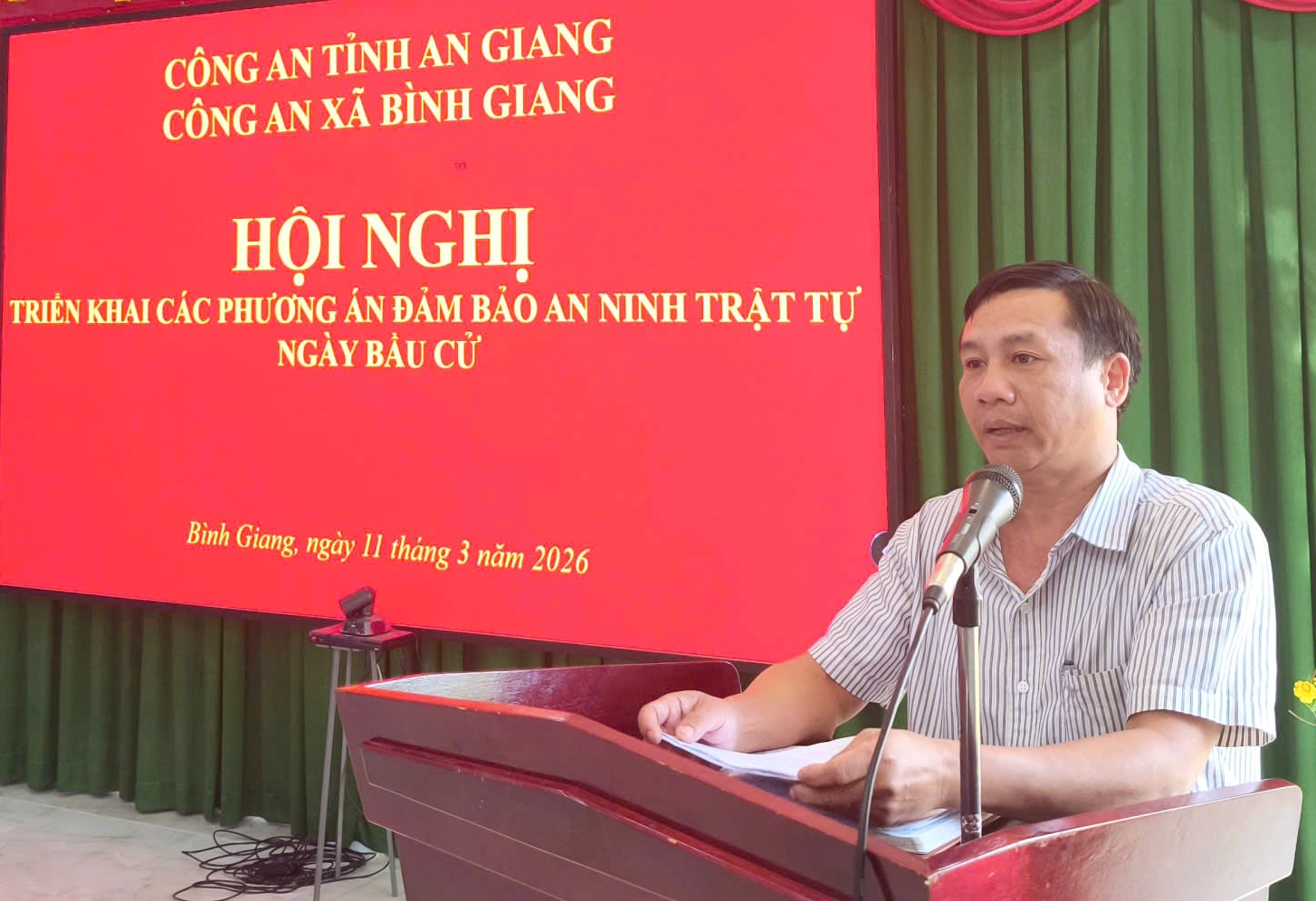 Ngày 11/3/2026, Công an xã Bình Giang tổ chức Hội nghị triển khai phương án bảo đảm an ninh trật tự phục vụ bầu cử đại biểu Quốc hội khóa XVI và đại biểu HĐND các cấp nhiệm kỳ 2026-2031. Hội nghị có sự tham gia của Phó Chủ tịch UBND xã Phạm Văn Hà, Ban Chỉ huy Công an xã, Ban Chỉ huy Quân sự xã cùng các cán bộ và lực lượng bảo đảm an ninh trật tự.