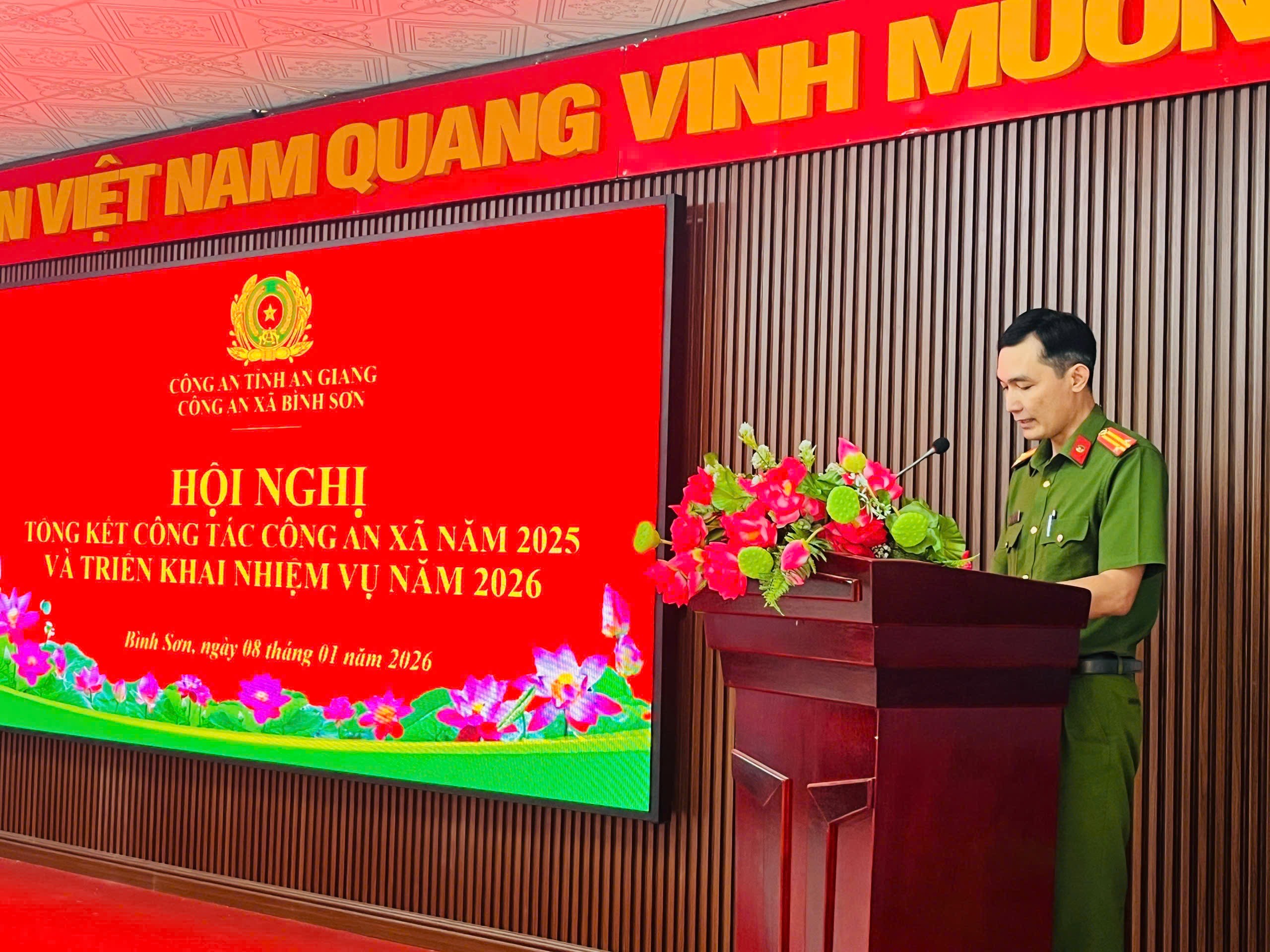 Phát biểu chỉ đạo tại Hội nghị tổng kết công tác Công an năm 2025, đồng chí Đào Xuân Nha - Phó Bí thư Đảng ủy, Chủ tịch UBND xã đã ghi nhận, biểu dương tinh thần “vì Nhân dân phục vụ” và những thành tích đã đạt của lực lượng Công an xã được trong năm 2025. Đồng thời đề nghị lực lượng Công an xã sẽ tiếp tục đoàn kết hoàn thành xuất sắc nhiệm vụ được giao trong năm 2026, góp phần giữ vững bình yên cho Nhân dân, xây dựng xã Bình Sơn phát triển bền vững, văn minh, an ninh, an toàn.