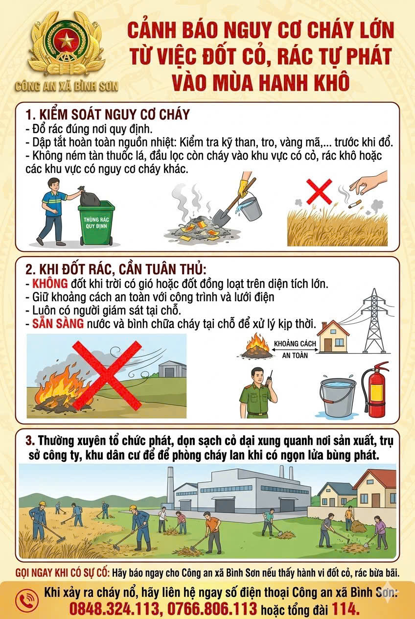 Ngoài ra, lực lượng chức năng tăng cường kiểm tra, nhắc nhở các điểm có nguy cơ cao, kịp thời phát hiện và xử lý các vi phạm liên quan đến an toàn PCCC. Đồng thời, vận động Nhân dân tích cực tham gia phong trào “Toàn dân tham gia phòng cháy, chữa cháy”, nâng cao ý thức tự phòng, tự quản trong cộng đồng. Mỗi người dân cần nêu cao tinh thần trách nhiệm, chủ động phòng ngừa, kịp thời báo tin cho lực lượng chức năng khi phát hiện cháy, nổ hoặc các nguy cơ mất an toàn về PCCC. Chung tay thực hiện tốt công tác phòng cháy, chữa cháy chính là góp phần bảo vệ tính mạng, tài sản của bản thân, gia đình và cộng đồng, giữ vững an ninh trật tự trên địa bàn xã trong mùa khô.