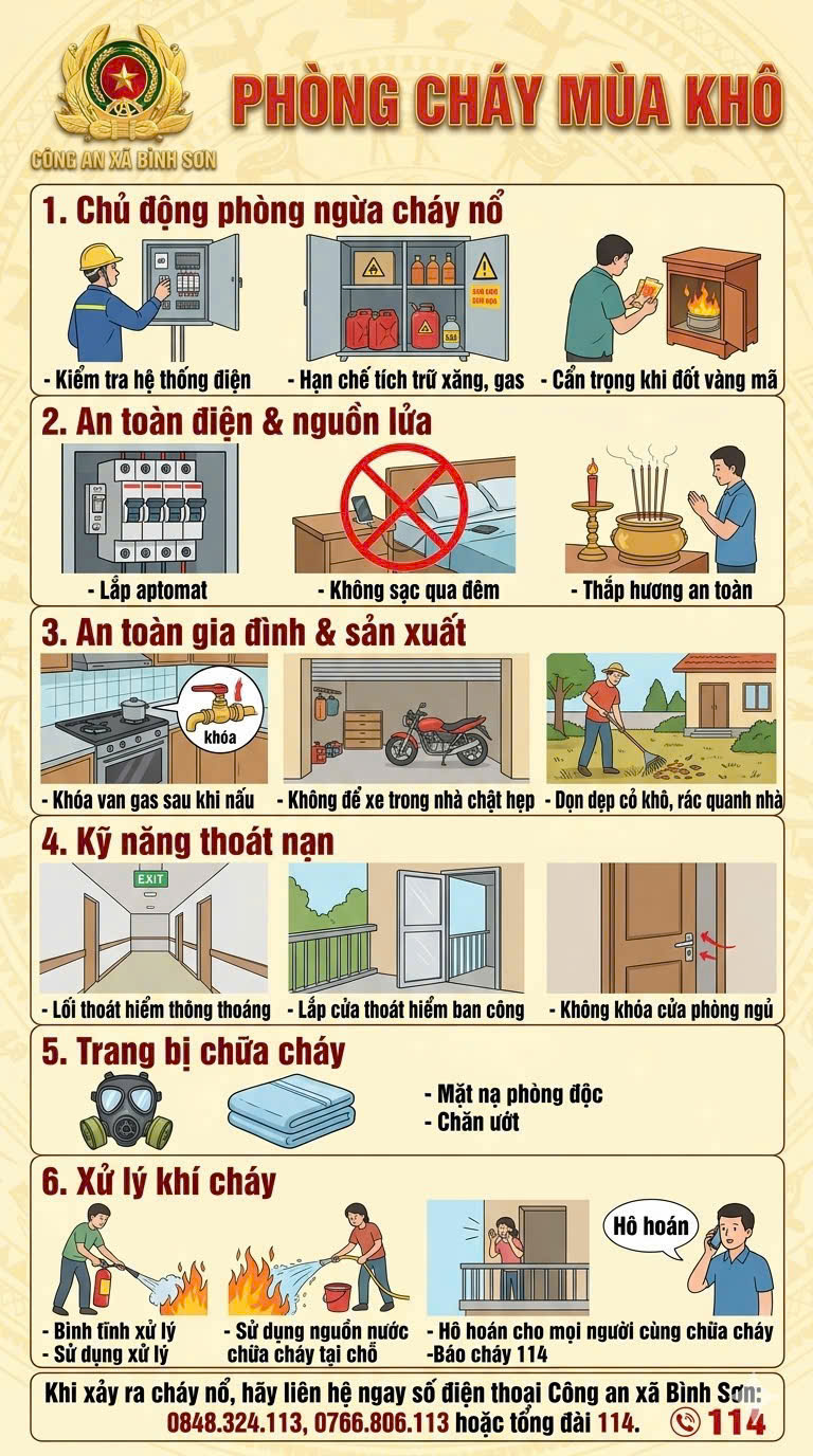 Bên cạnh đó, Công an xã cũng khuyến cáo các hộ gia đình trang bị phương tiện chữa cháy tại chỗ như bình chữa cháy xách tay, xô, chậu, cát…; trang bị kỹ năng thoát nạn khi có sự cố xảy ra. Đối với các cơ sở kinh doanh, cần chấp hành nghiêm các quy định về PCCC, bố trí lối thoát hiểm, hệ thống điện an toàn và thường xuyên tổ chức kiểm tra, tự rà soát nguy cơ cháy nổ.