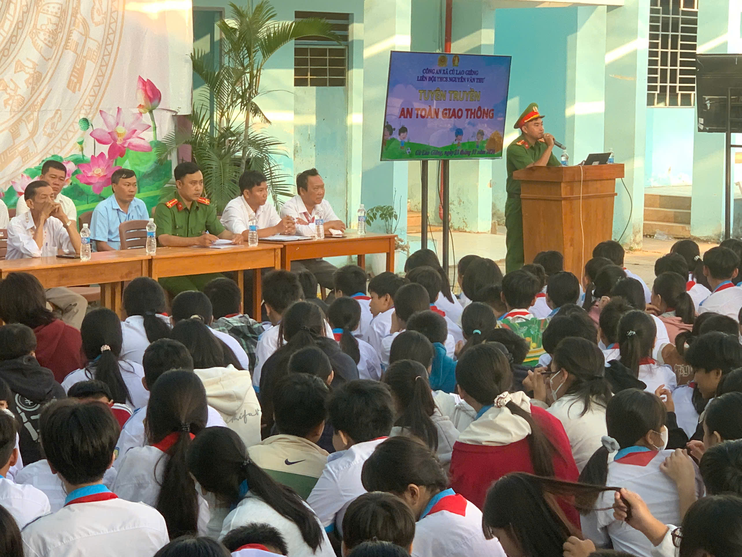 Tham dự buổi tuyên truyền có hơn 50 giáo viên, 800 lượt học sinh của nhà trường. Qua đó, lực lượng công an xã đã thông tin đến quý thầy cô, các em học sinh về tình hình tai nạn giao thông trên địa bàn xã trong thời gian qua; các lỗi phổ biến mà các em học sinh thường hay mắc phải khi tham gia giao thông và hướng dẫn các bước cơ bản để tham gia giao thông an toàn như: cách cài nón bảo hiểm đúng quy định, cách qua đường an toàn, cách nhận biết hệ thống biển báo giao thông, quy tắc điều khiển xe đạp và xe đạp điện đúng quy định,… Nội dung tuyên truyền được truyền tải sinh động, gần gũi, dễ hiểu tạo không khí vui tươi, phấn khởi, giúp các em học sinh dễ áp dụng vào thực tế.