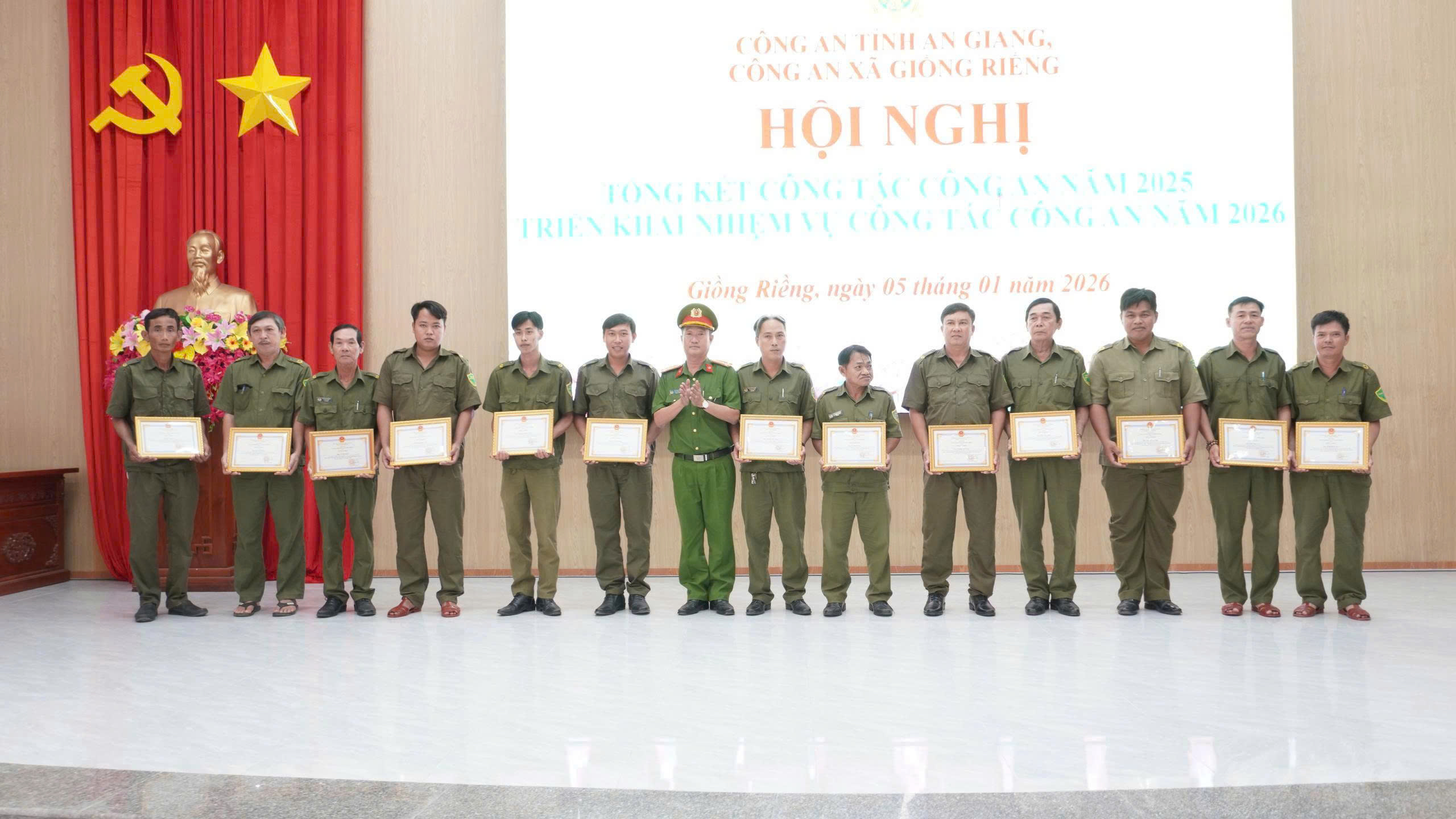 Ghi nhận những thành tích đạt được, Giám đốc Công an tỉnh An Giang đã quyết định tặng danh hiệu “Đơn vị Quyết thắng” cho tập thể Công an xã Giồng Riềng. Chủ tịch UBND xã cũng tặng Giấy khen cho các tập thể và cá nhân có thành tích xuất sắc, tiêu biểu trong thực hiện nhiệm vụ công tác năm 2025.
