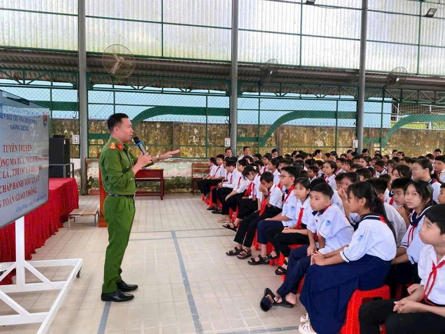 Ngày 17/9/2025, Công an xã Giồng Riềng phối hợp với Trường Phổ thông dân tộc nội trú, Trung học cơ sở Giồng Riềng tổ chức buổi tuyên truyền chuyên đề về phòng, chống ma túy; tác hại của thuốc lá, thuốc lá điện tử và chấp hành pháp luật an toàn giao thông cho học sinh.