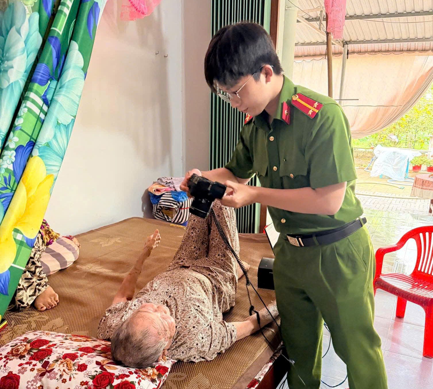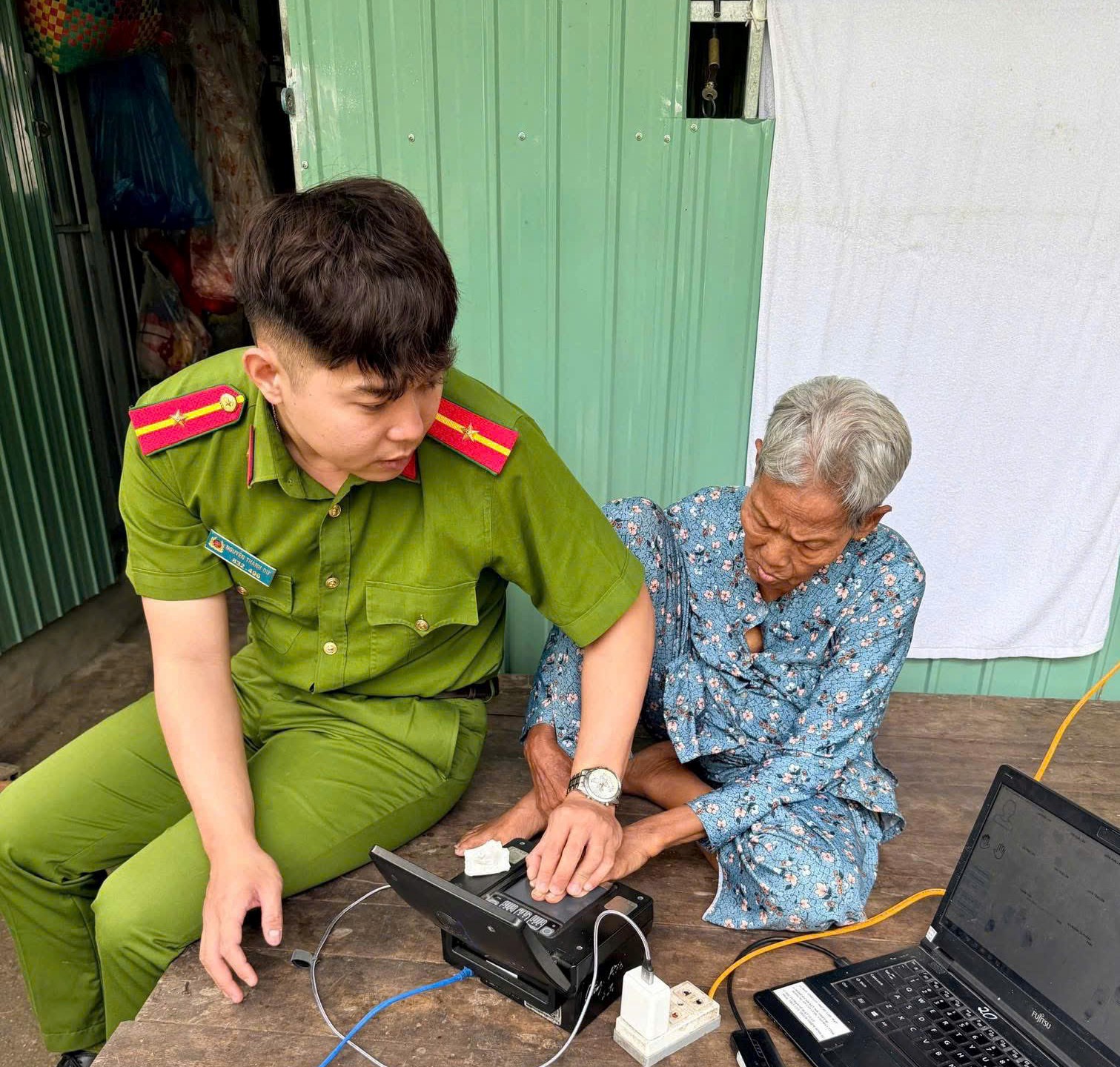 Cán bộ, chiến sĩ Công an xã hỗ trợ người dân đi lại khó khăn làm căn cước, định danh điện tử tại nhà.