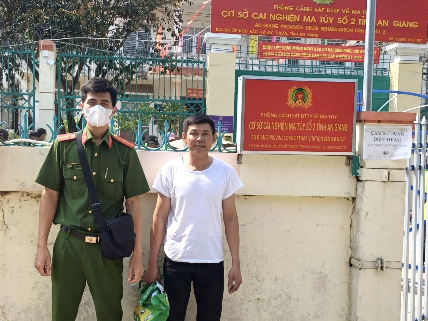 Công an xã Hoà Thuận đưa đối tượng vào cơ sở cai nghiện bắt buộc.