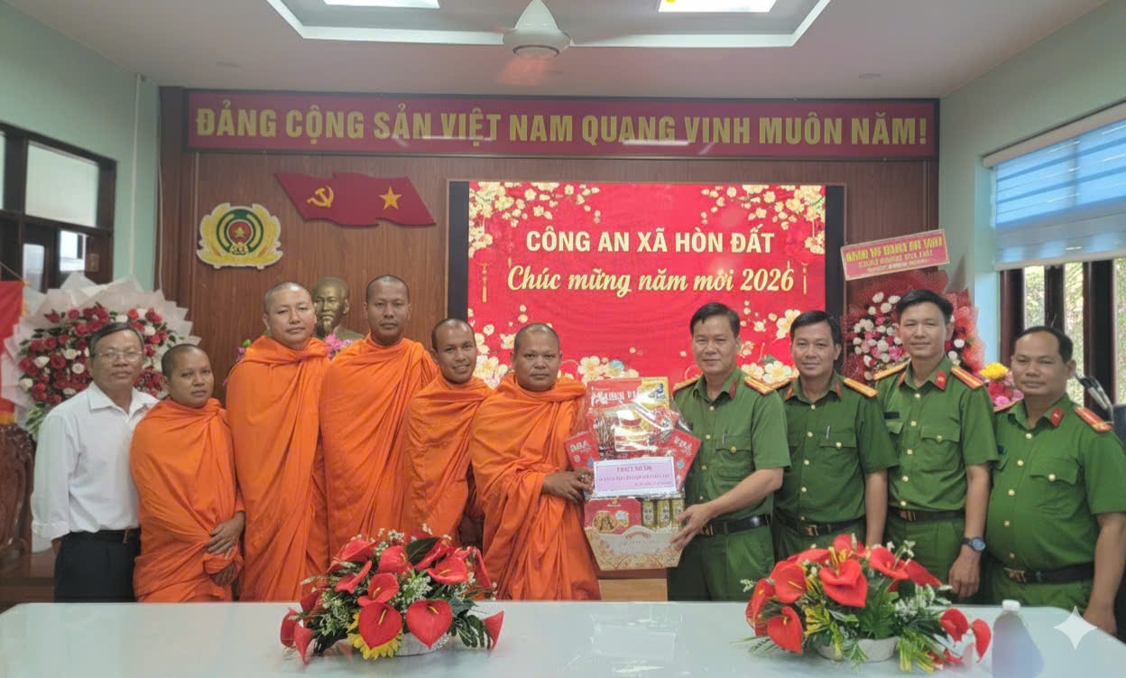 Trong không khí hân hoan chuẩn bị đón Tết Nguyên đán Bình Ngọ năm 2026, Sư sãi, người có uy tín trong vùng đồng bào dân tộc Khmer, đại diện các chùa Khmer Lình Huỳnh, chùa Khmer Chòm Chuối, chùa Khmer Kinh 12, chùa Khmer Hòn Sóc, chùa Khmer Hòn Me đến thăm hỏi và chúc mừng năm mới trong chỉ huy, cán bộ, chiến sĩ Công an xã Hòn Đất, tỉnh An Giang. Bày tỏ sự vui mừng, cảm ơn trước sự quan tâm của các cấp uỷ, chính quyền địa phương, nhất là lực lượng Công an xã trong đảm bảo an ninh, trật tự các dịp Lễ hội Khmer Nam tông tại địa phương, tạo môi trường an toàn, lành mạnh để đồng bào dân tộc Khmer tổ chức các hoạt động tôn giáo thuần tuý tuân thủ theo các quy định của pháp luật.