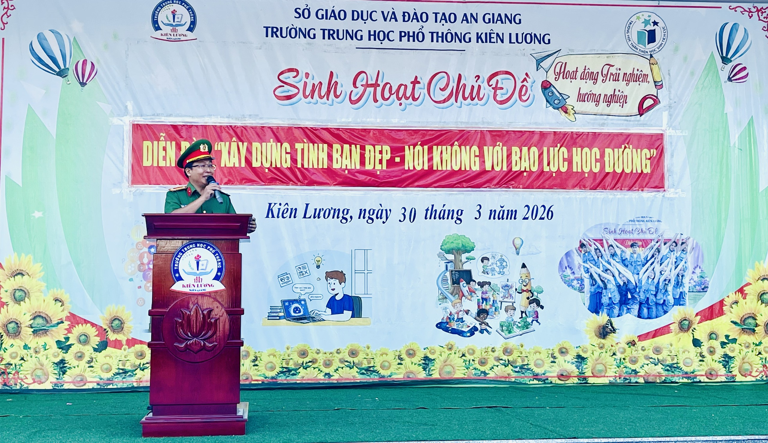‎Sáng ngày 30/3/2026, tại chương trình sinh hoạt đầu tuần của Trường THPT Kiên Lương, Công an xã Kiên Lương đã phối hợp cùng Ban Giám hiệu và Đoàn trường tổ chức tuyên truyền thông tin tuyển sinh Công an nhân dân năm 2026 lồng ghép tuyên truyền chủ đề “Xây dựng tình bạn đẹp – Nói không với bạo lực học đường”.