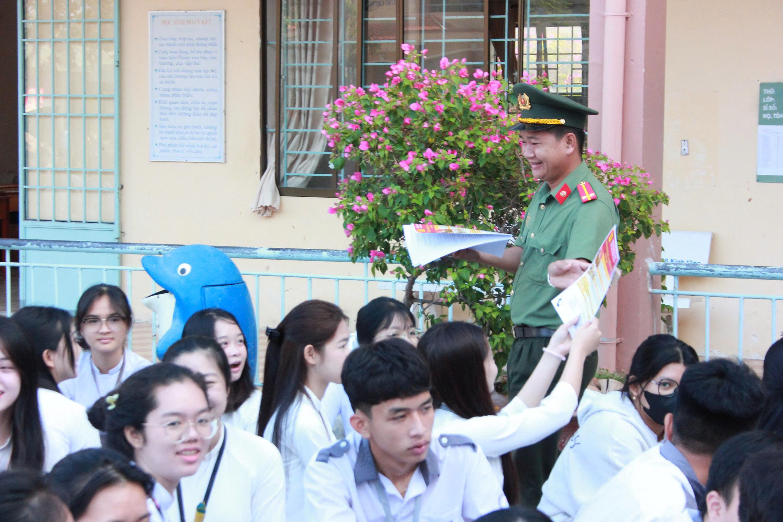Đồng chí Trung tá Trần Hữu Khiêm – Phó Trưởng Công an xã phổ biến, giáo dục pháp luật cho học sinh