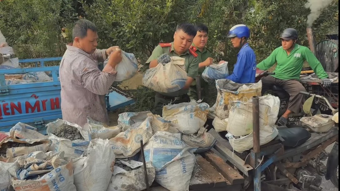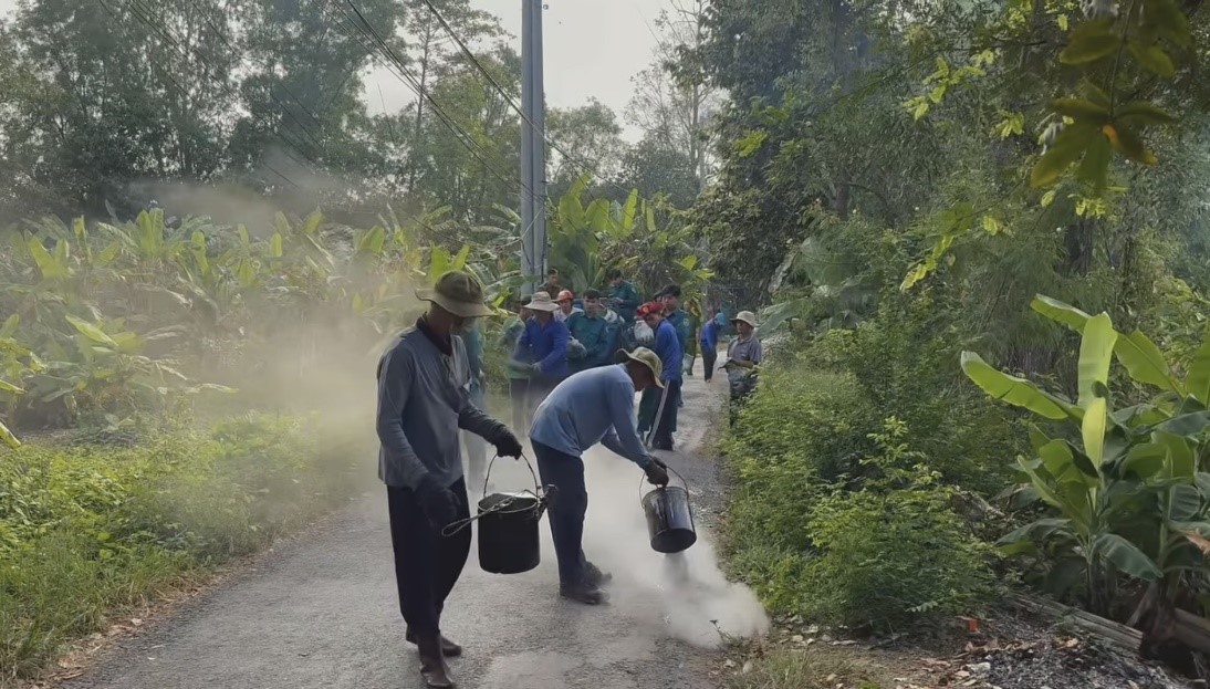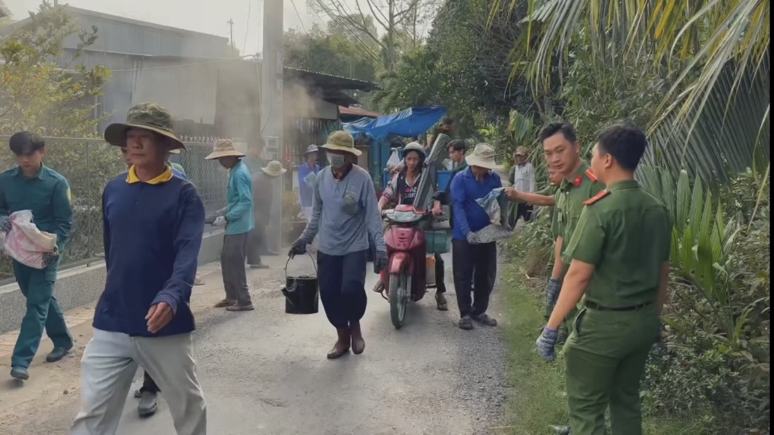 Công an xã Mỹ Hòa Hưng chung tay cùng Nhân dân dặm vá tuyến đường nhựa nông thôn trên địa bàn xã