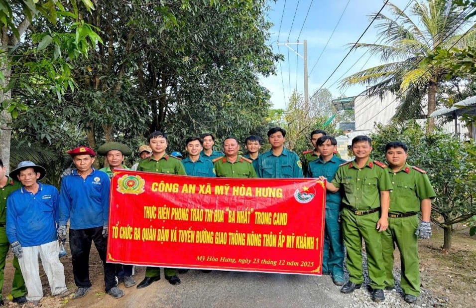 Tích cực hưởng ứng phong trào thi đua “Ba nhất: Kỷ luật nhất - Trung thành nhất - Gần dân nhất” do Bộ Công an và Công an tỉnh An Giang phát động, trong 02 ngày vừa qua 23 và 24/12/2025, Công an xã Mỹ Hòa Hưng cùng lực lượng Dân quân thường trực, Tổ Từ thiện và người dân xã thực hiện hoạt động dặm vá tuyến đường nhựa nông thôn, có chiều dài khoảng 02 km thuộc ấp Mỹ Khánh 1, xã Mỹ Hòa Hưng.