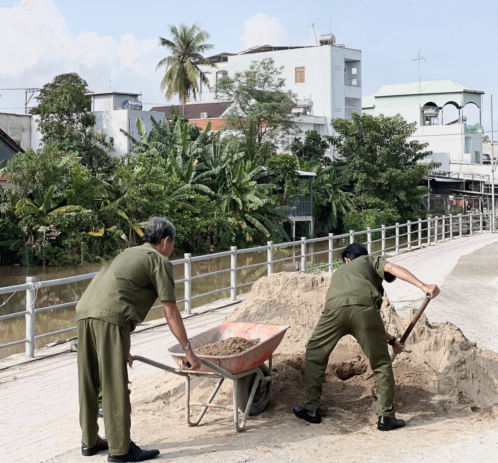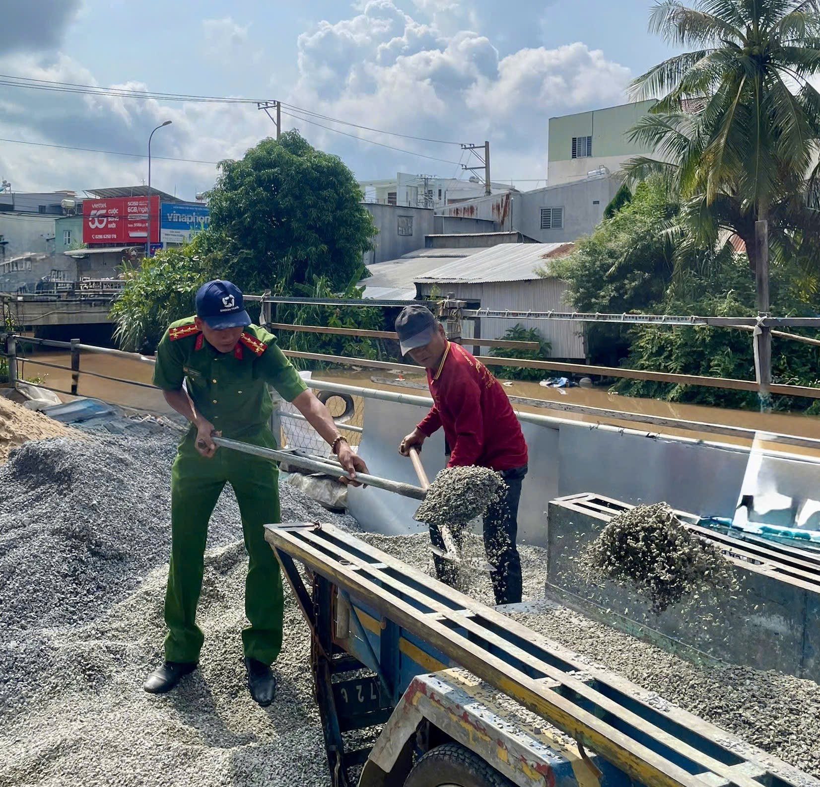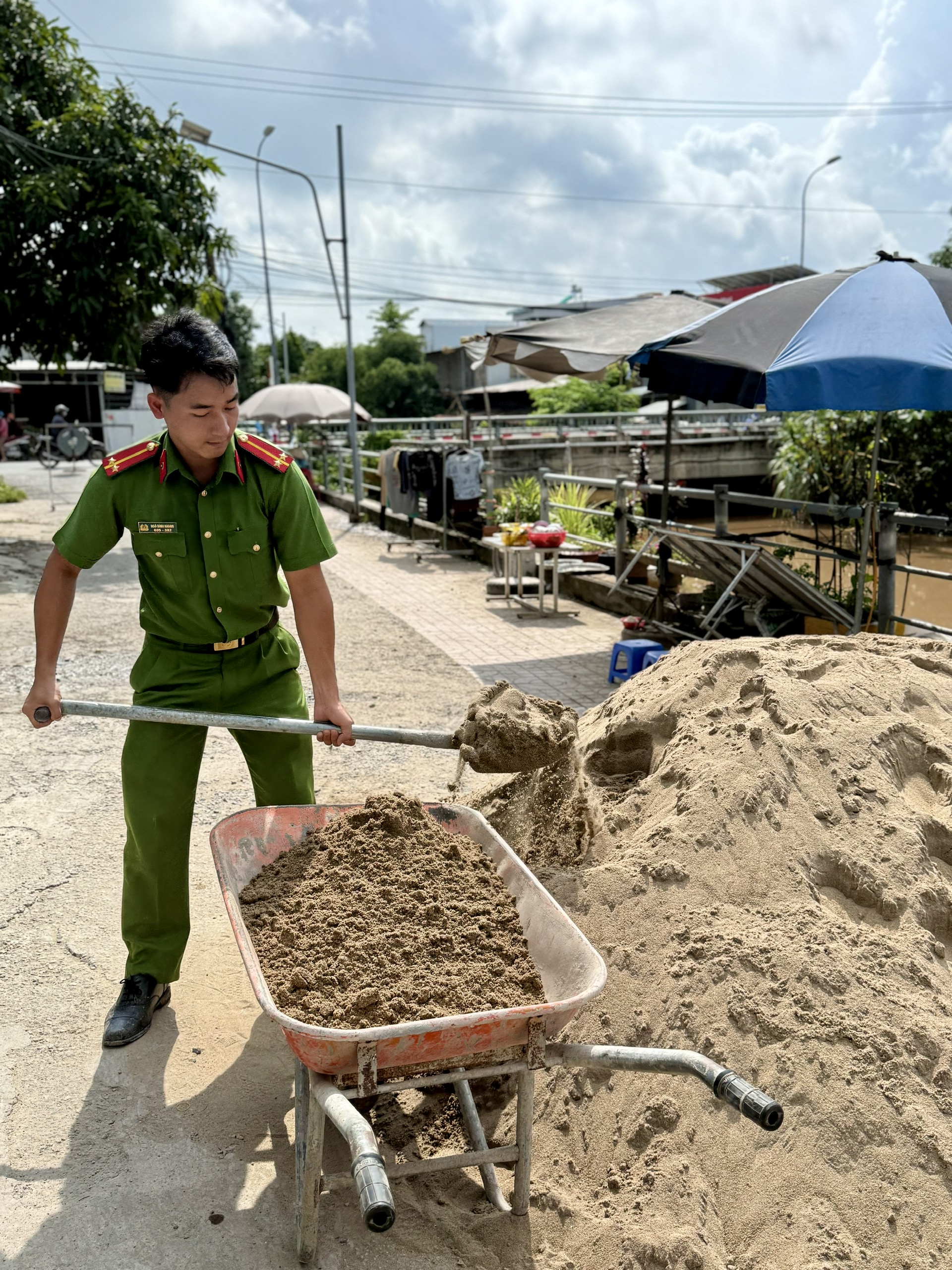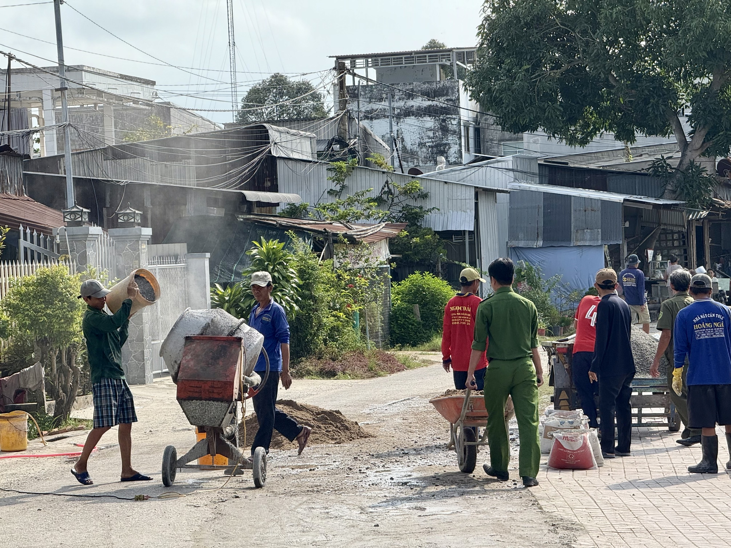 Trước tình hình đó, Công an xã Phú Tân đã chủ động phối hợp với Tổ từ thiện và người dân địa phương tổ chức dặm vá, san lấp các ổ gà, đổ bê tông những đoạn hư hỏng nặng. Cán bộ, chiến sĩ Công an xã không ngại vất vả, trực tiếp cùng bà con vận chuyển vật liệu, trộn bê tông, xúc đất, san đường trong tinh thần hăng say, trách nhiệm.