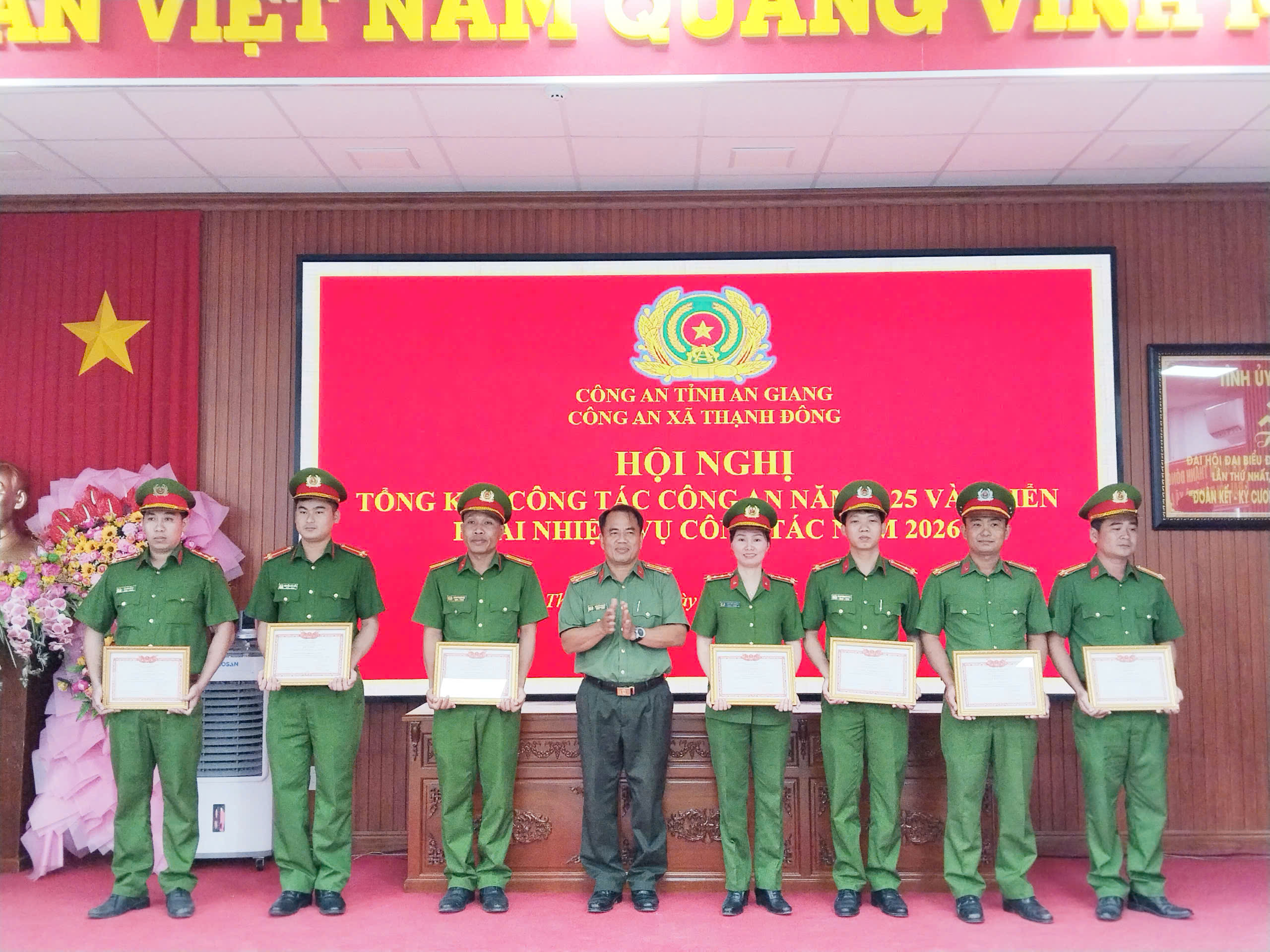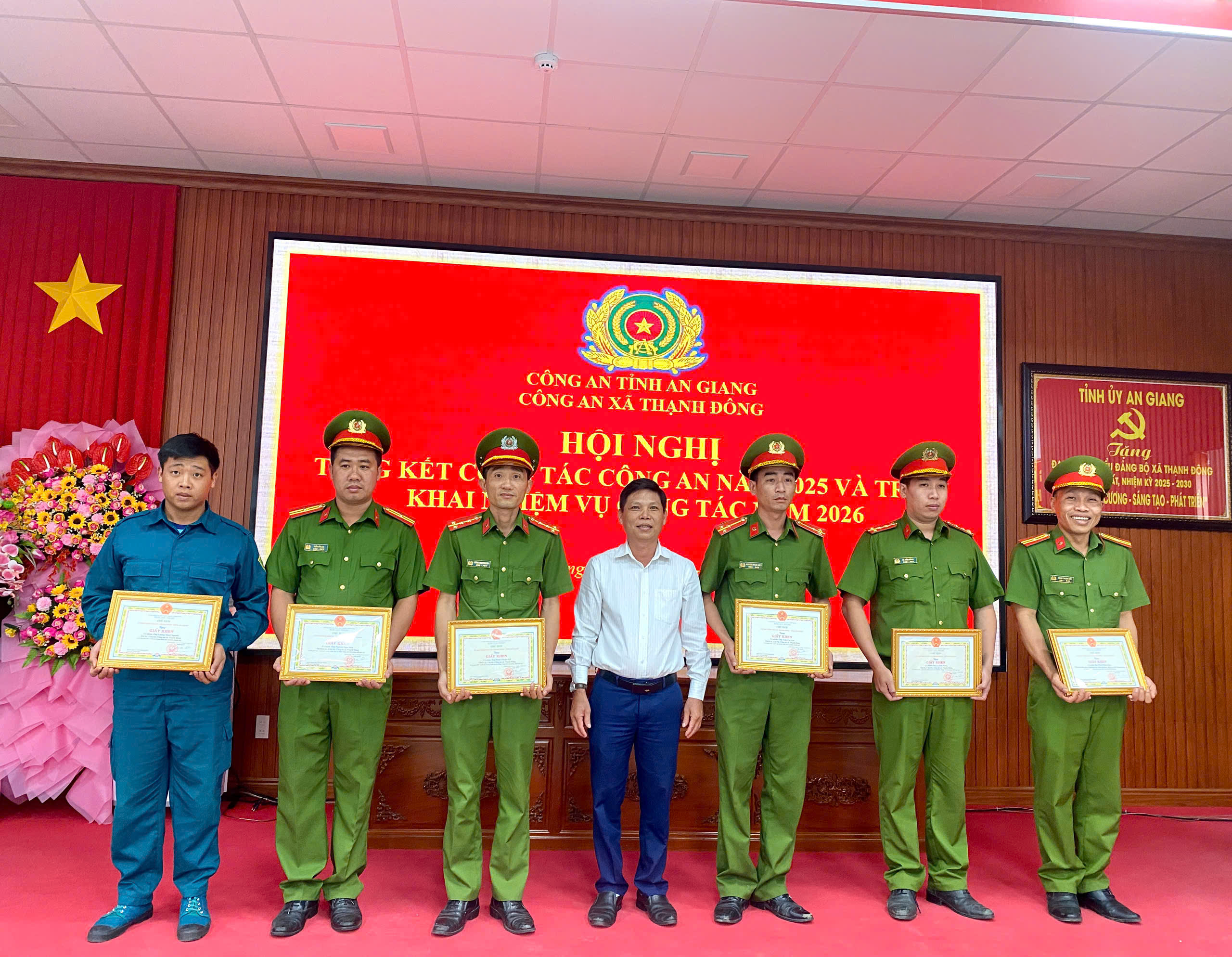 Với những thành tích đạt được, Công an xã Thạnh Đông được Giám đốc Công an tỉnh tặng danh hiệu “Đơn vị quyết thắng”, 09 cá nhân được tặng danh hiệu “Chiến sĩ thi đua cơ sở”. Dịp này, Chủ tịch UBND xã Thạnh Đông tặng 07 Giấy khen cho 06 cá nhân thuộc Công an xã, 01 cá nhân là thành viên Tổ ANTT ở cơ sở vì có thành tích đột xuất, xuất sắc trong công tác đấu tranh, phòng, chống tội phạm. Dịp này, hội nghị cũng đã phát động phong trào thi đua “Vì an ninh Tổ quốc” năm 2026.