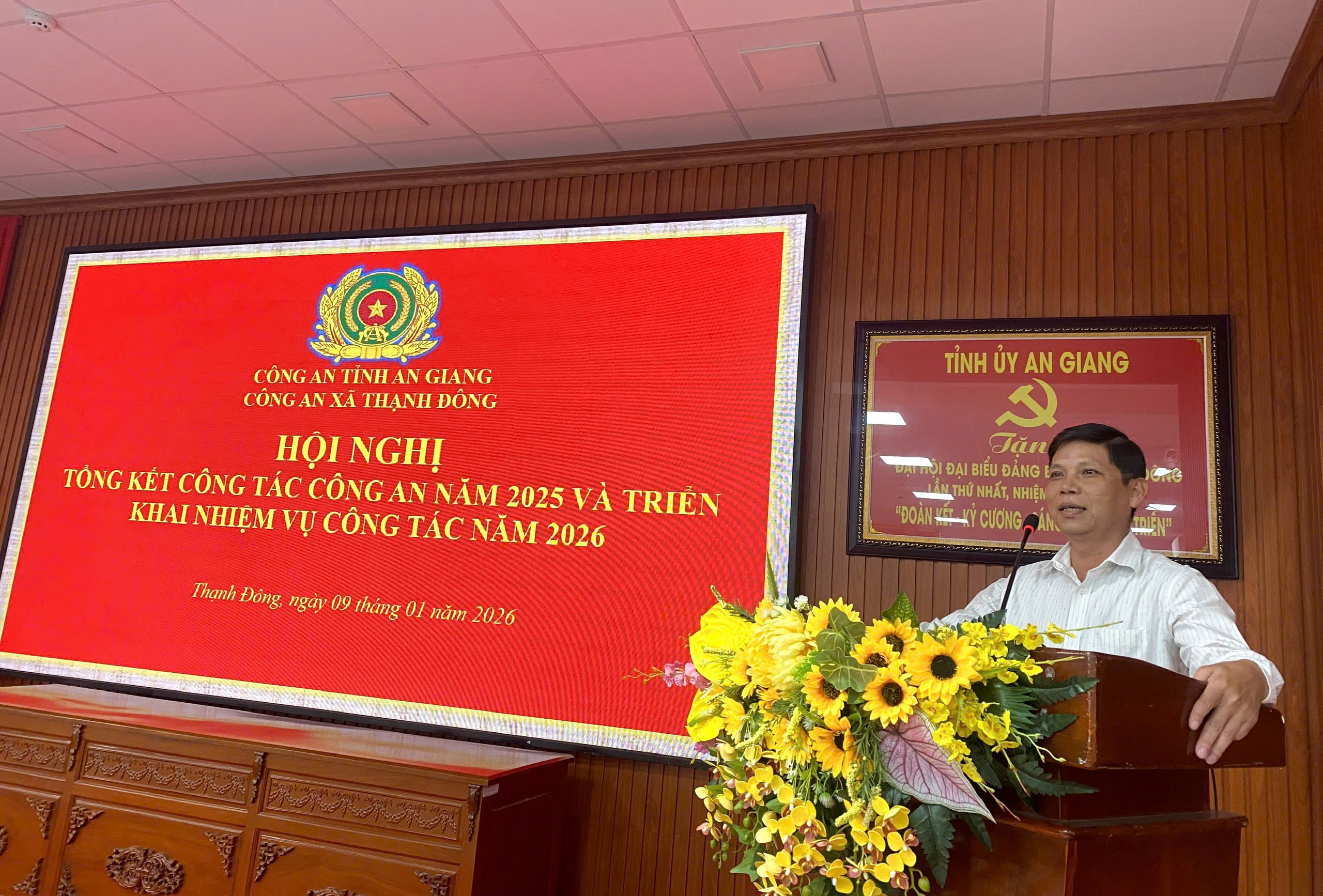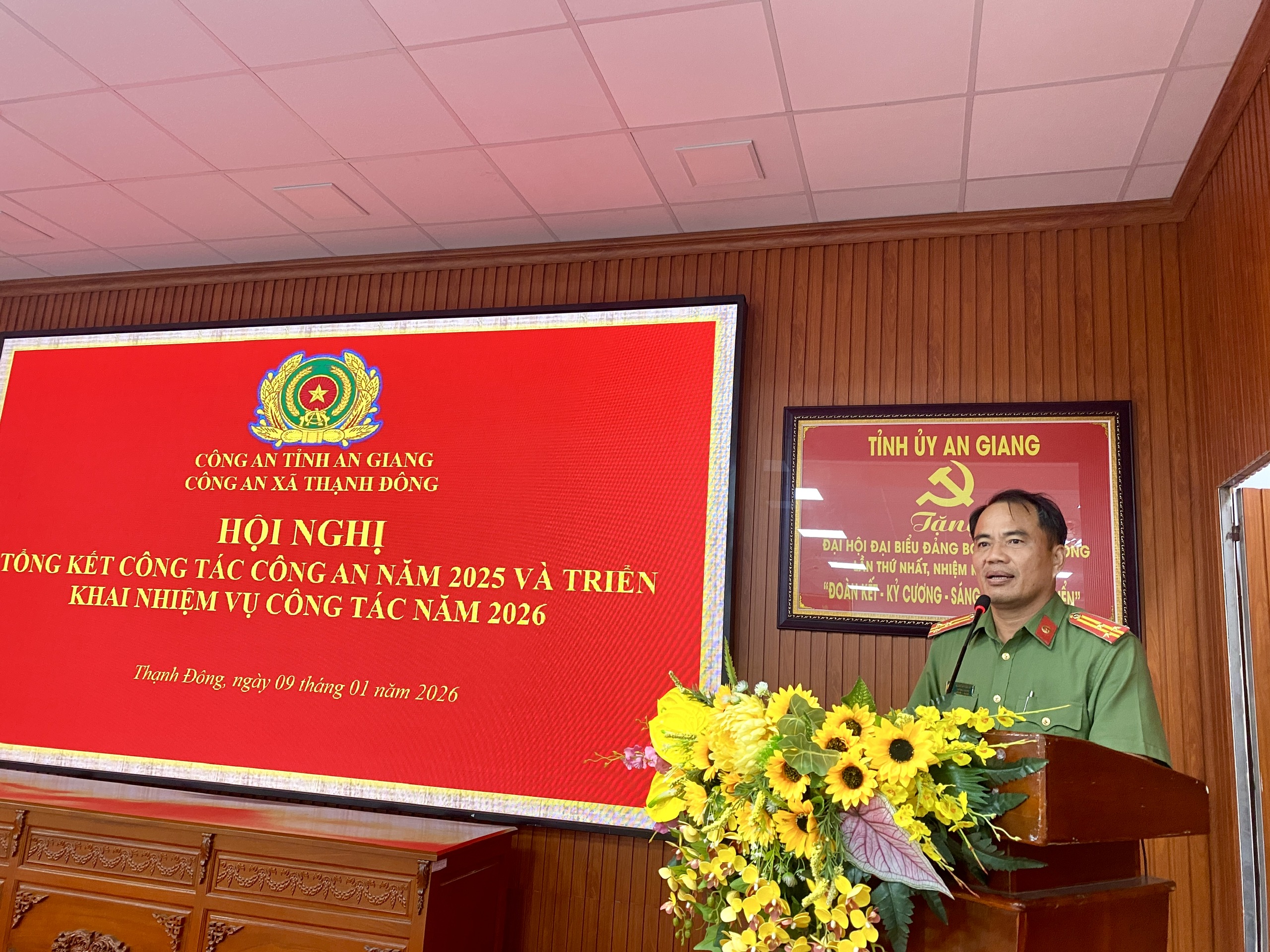 Ngày 09/01/2026, Công an xã Thạnh Đông tổ chức Hội nghị tổng kết công tác Công an năm 2025 và triển khai phương hướng, nhiệm vụ năm 2026. Đến dự và chỉ đạo Hội nghị có đồng chí Thượng tá Nguyễn Văn Đủ, Trưởng Phòng Kỹ thuật nghiệp vụ và ngoại tuyến, Tổ trưởng Tổ Chỉ đạo Công an xã Thạnh Đông; đồng chí Huỳnh Thị Thanh Yến, Phó Bí thư Thường trực Đảng ủy, Chủ tịch HĐND xã; đồng chí Nguyễn Quốc Việt, Ủy viên Ban Thường vụ Đảng ủy, Phó Chủ tịch UBND xã; đại diện các ban, ngành, đoàn thể xã cùng hơn 70 đại biểu là cán bộ, chiến sĩ thuộc các Tổ nghiệp vụ, Tổ trưởng Tổ ANTT cơ sở các ấp. Đồng chí Trung tá Hồ Thanh Quang, Trưởng Công an xã chủ trì Hội nghị.