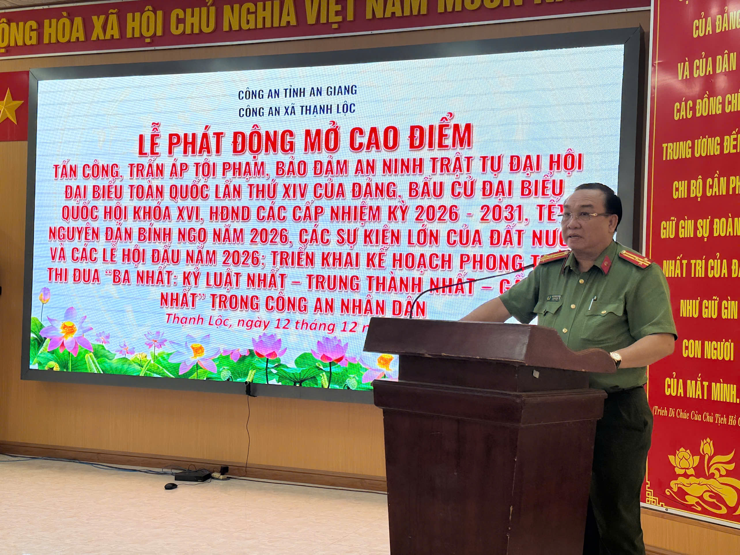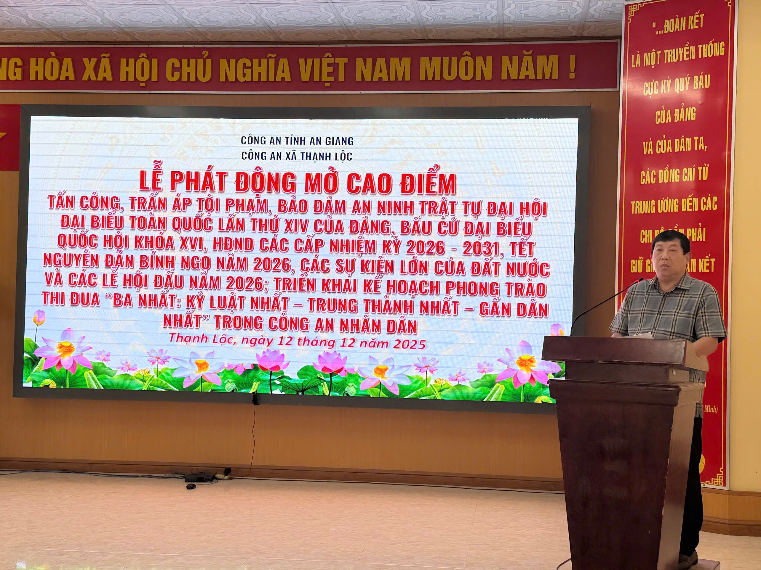 Thực hiện chỉ đạo của Giám đốc Công an tỉnh, sáng ngày 12/12/2025, Công an xã Thạnh Lộc tổ chức Lễ ra quân phát động mở cao điểm tấn công trấn áp tội phạm, bảo đảm an ninh trật tự Đại hội đại biểu toàn quốc lần thứ XIV của Đảng, Bầu cử Đại biểu Quốc hội khóa XVI, Hội đồng nhân dân các cấp nhiệm kỳ 2026 - 2031, Tết Nguyên đán Bính Ngọ 2026, các sự kiện lớn của đất nước và các lễ hội đầu năm 2026. Đồng thời, triển khai, quán triệt kế hoạch phong trào thi đua “Ba nhất: Kỷ luật nhất - Trung thành nhất - Gần dân nhất” trong Công an nhân dân.