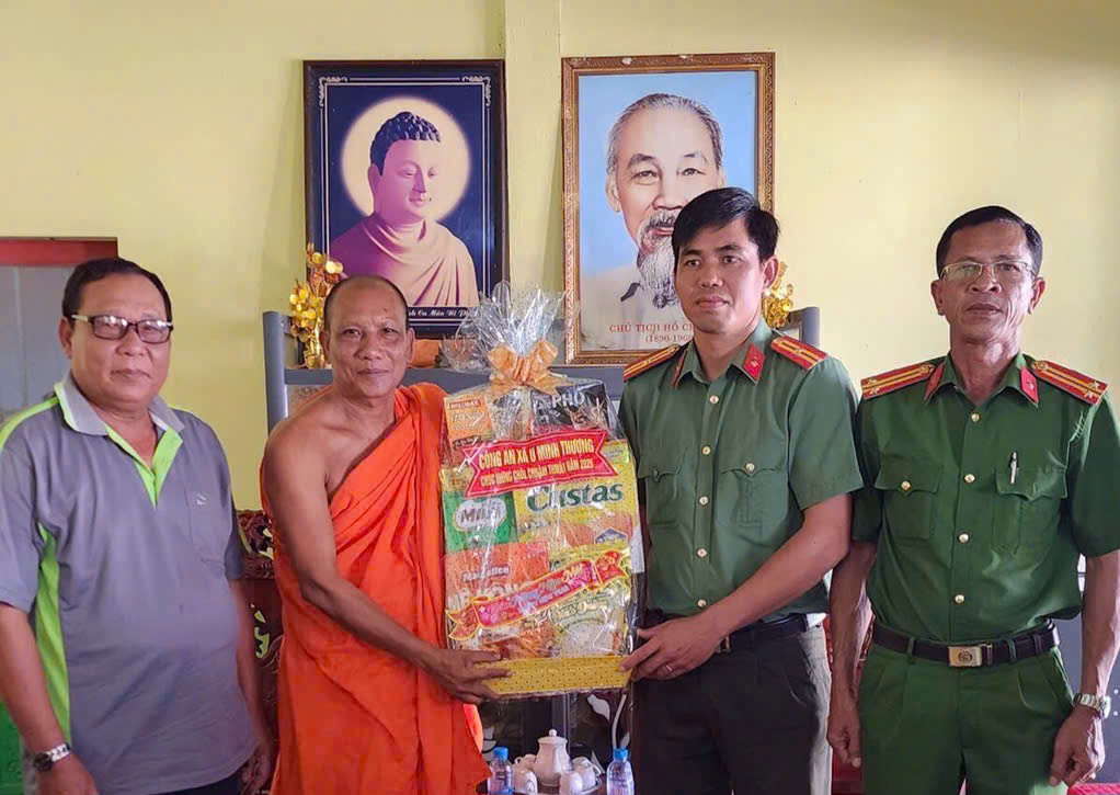 Đoàn công tác của Công an xã do đồng chí Trung tá Danh Điều - Phó Trưởng Công an xã làm trưởng đoàn đã đến thăm, chúc Tết, tặng quà tại chùa Ngã Năm Bình Minh. Thay mặt đoàn, Trung tá Danh Điều gửi lời chúc mừng năm mới đến thành viên Ban Quản trị, các vị sư sãi, người có uy tín và đồng bào dân tộc Khmer đón Tết Chôl Chnăm Thmây vui tươi, an lành và hạnh phúc.