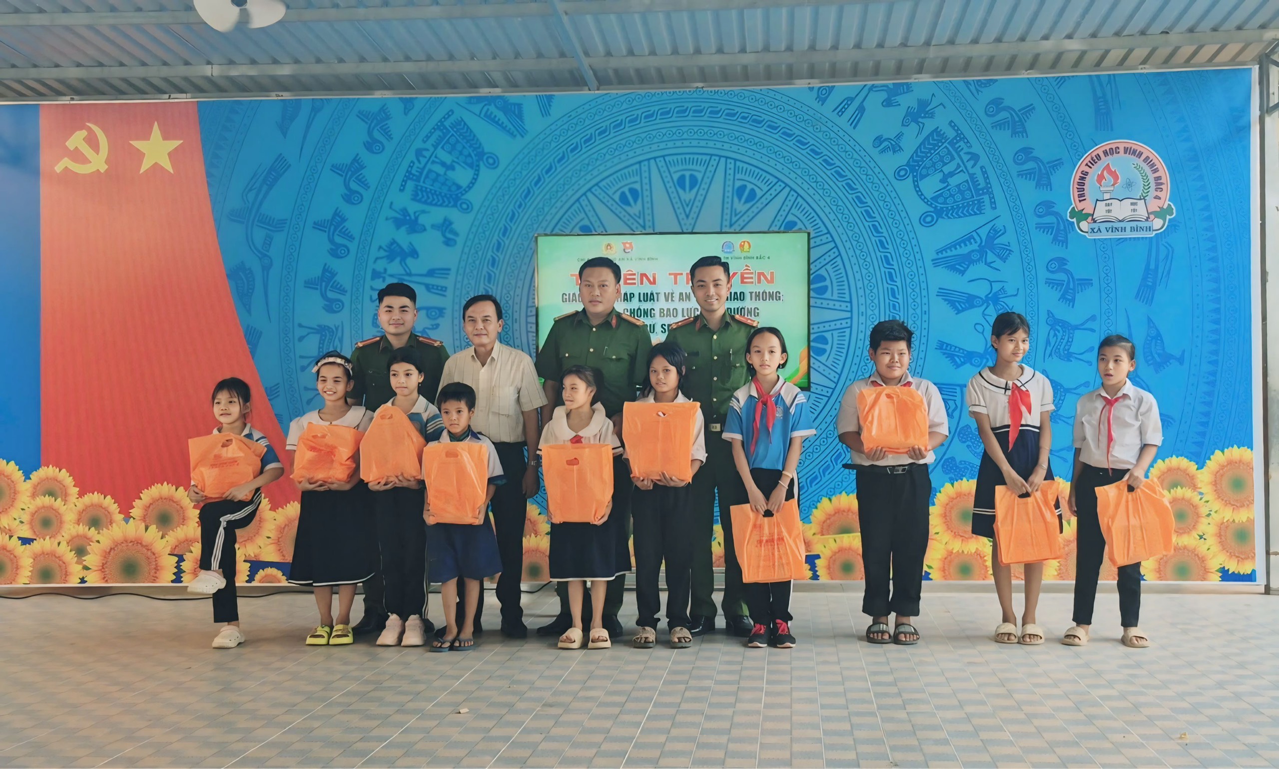 Nhân dịp này, Công an xã Vĩnh Bình đã trao tặng 10 phần quà cho các em học sinh có thành tích học tập tốt, hoàn cảnh khó khăn nhằm động viên, khích lệ tinh thần học tập và rèn luyện.