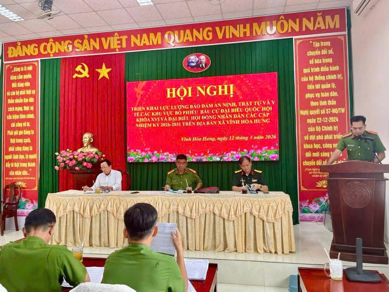 Nhằm chủ động trong việc thực hiện công tác đảm bảo an ninh trật tự trên địa bàn bảo đảm an ninh, an toàn cuộc bầu cử đại biểu Quốc hội khoá XVI và đại biểu HĐND các cấp nhiệm kỳ 2026 – 2031. Ngày 12/03/2026, Công an xã Vĩnh Hòa Hưng tổ chức hội nghị triển khai lực lượng bảo đảm an ninh, trật tự và y tế các khu vực bỏ phiếu bầu cử.