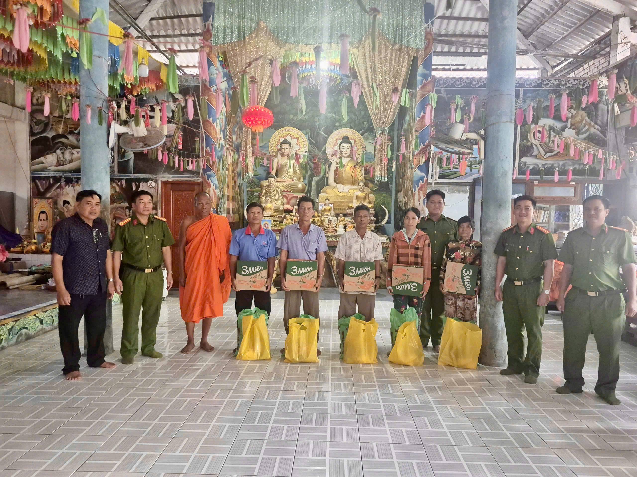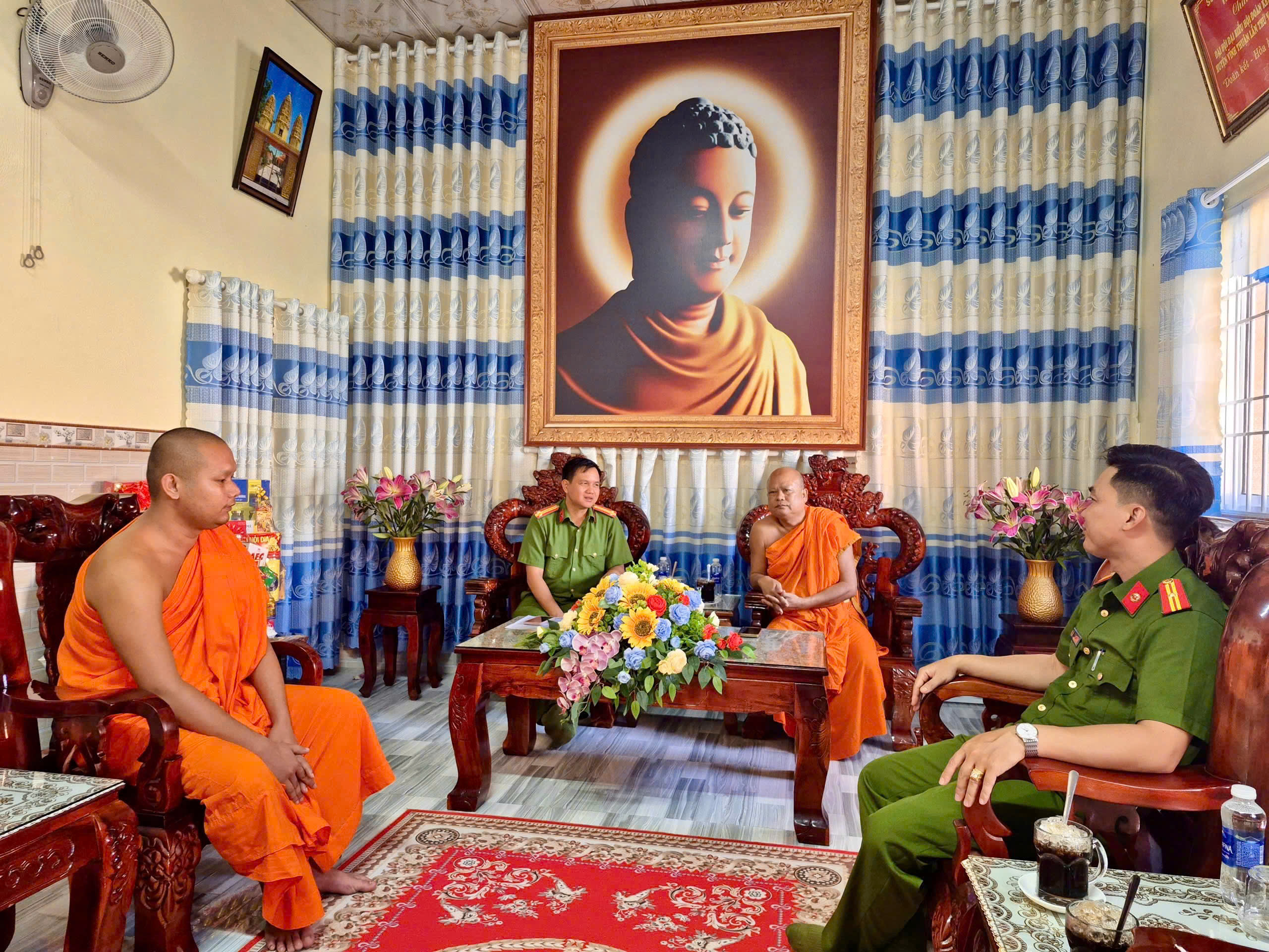 Tại các nơi đến thăm, đại diện Lãnh đạo Công an xã đã gửi lời chúc mừng năm mới đến các vị chức sắc, sư sãi cùng toàn thể bà con đồng bào dân tộc Khmer, chúc đón Tết trong không khí vui tươi, an toàn, lành mạnh, tiết kiệm.