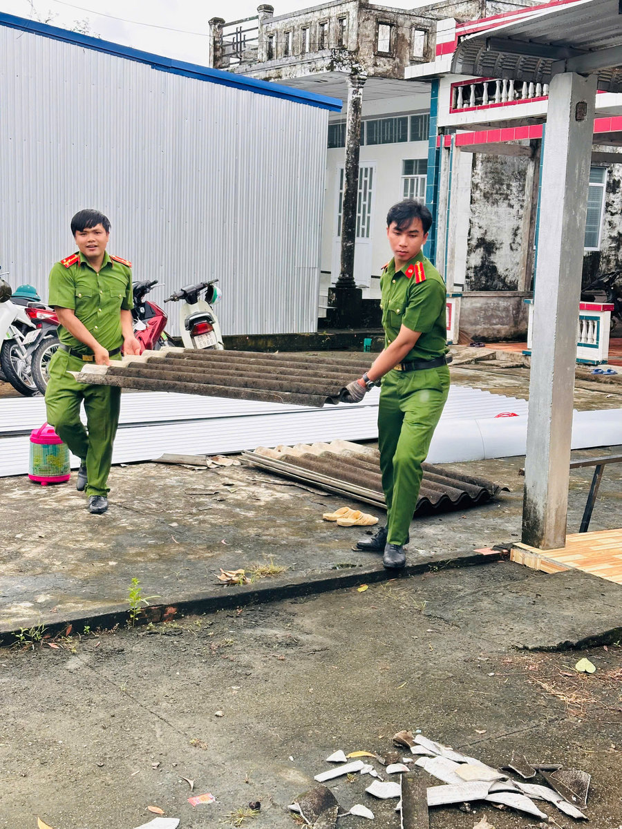 Công an xã Vĩnh Thuận hỗ trợ người dân khắc phục hậu quả sau lốc xoáy
