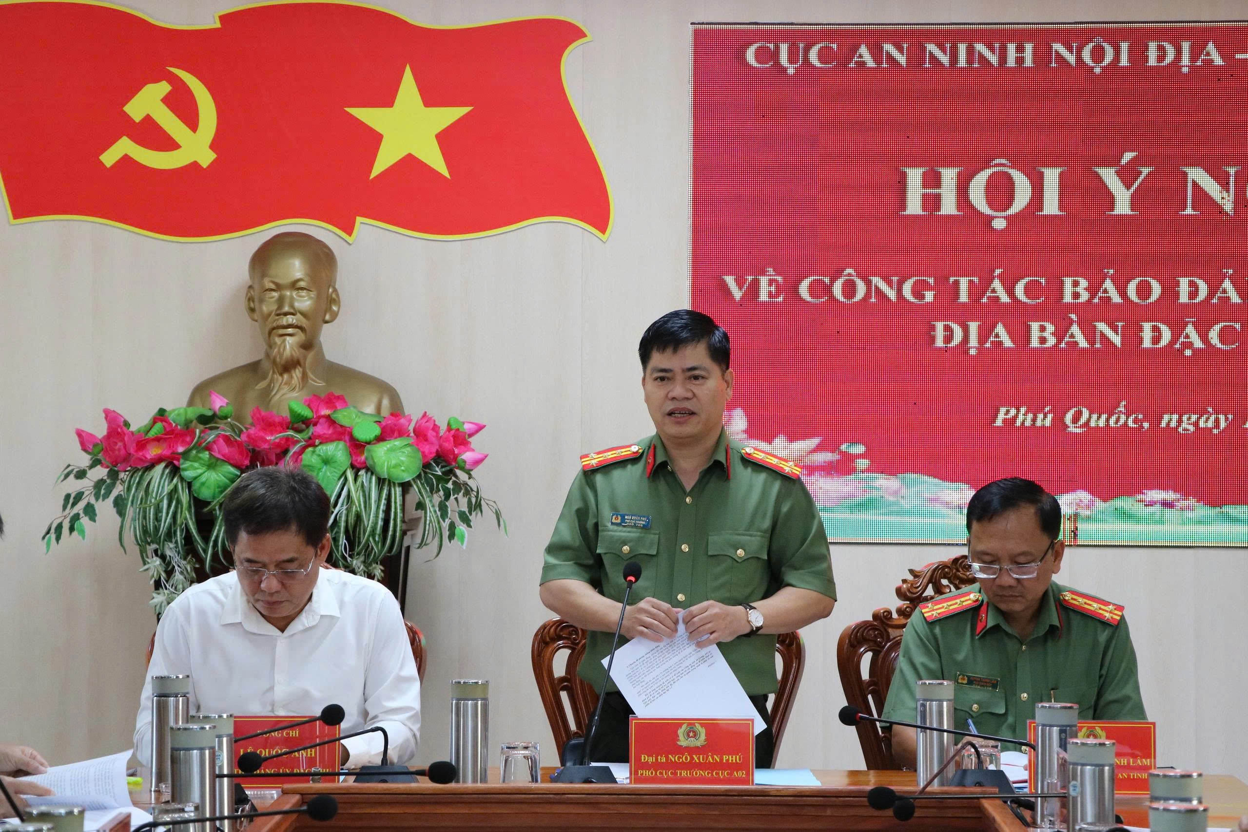 Phát biểu chỉ đạo, Đại tá Ngô Xuân Phú, Phó Cục trưởng Cục An ninh nội địa ghi nhận và biểu dương tinh thần chủ động, nỗ lực của lực lượng Công an tỉnh An Giang, đặc biệt là Công an đặc khu Phú Quốc, trong công tác nắm, dự báo, xử lý tình hình; góp phần bảo đảm an ninh, an toàn cho người dân và du khách. Đồng chí Phó Cục trưởng đề nghị thời gian tới, lực lượng công an địa phương tiếp tục tăng cường nắm tình hình cơ sở, chủ động tham mưu, phối hợp chặt chẽ với các ngành, địa phương trong công tác bảo vệ an ninh nội địa, không để xảy ra bị động, bất ngờ trong mọi tình huống.