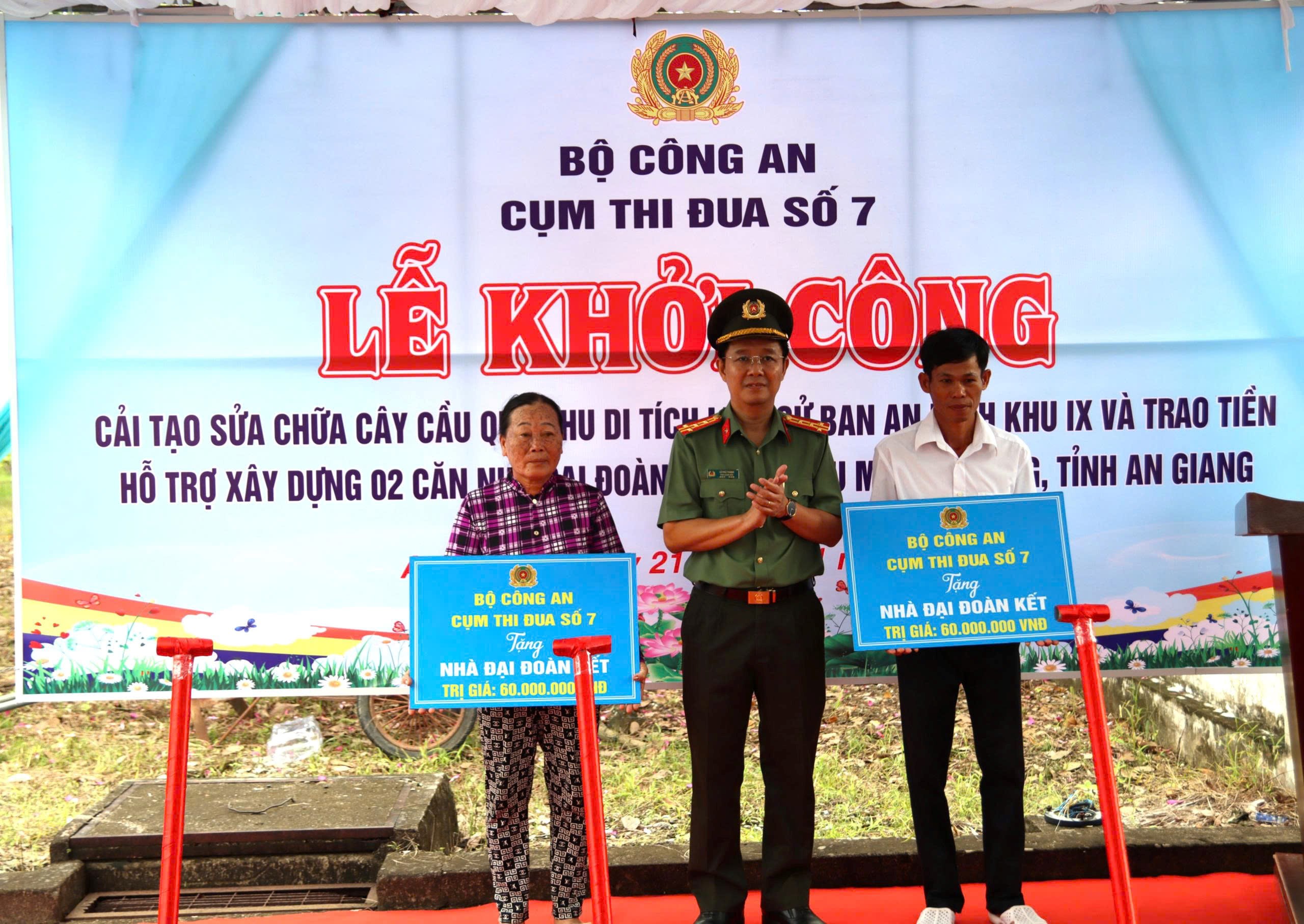 Dịp này, Cụm thi đua số 7 – Bộ Công an đã trao tiền hỗ trợ xây dựng 02 căn nhà Đại đoàn kết cho 02 hộ gia đình có hoàn cảnh khó khăn trên địa bàn xã U Minh Thượng, tỉnh An Giang, mỗi căn hỗ trợ 60 triệu đồng.