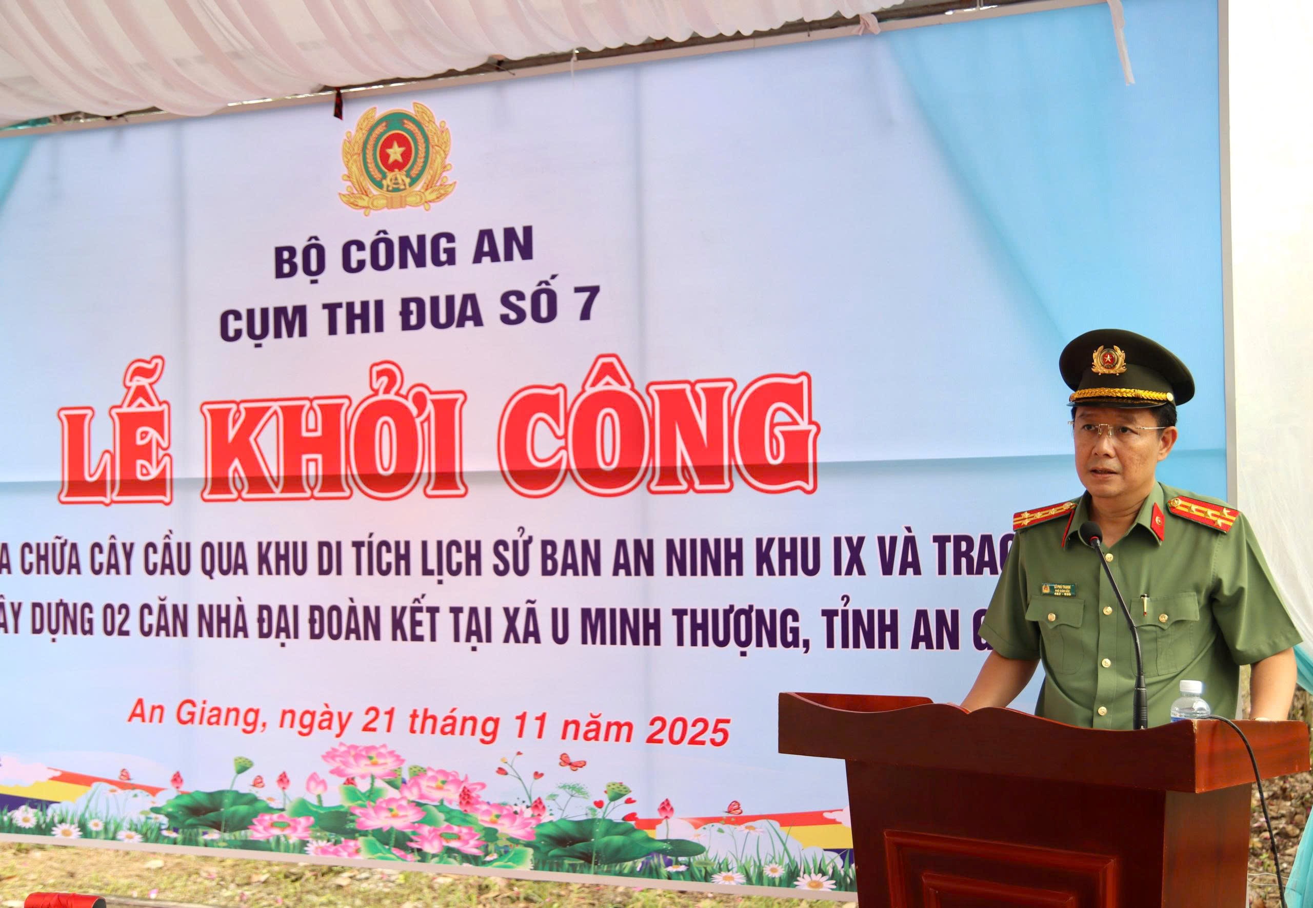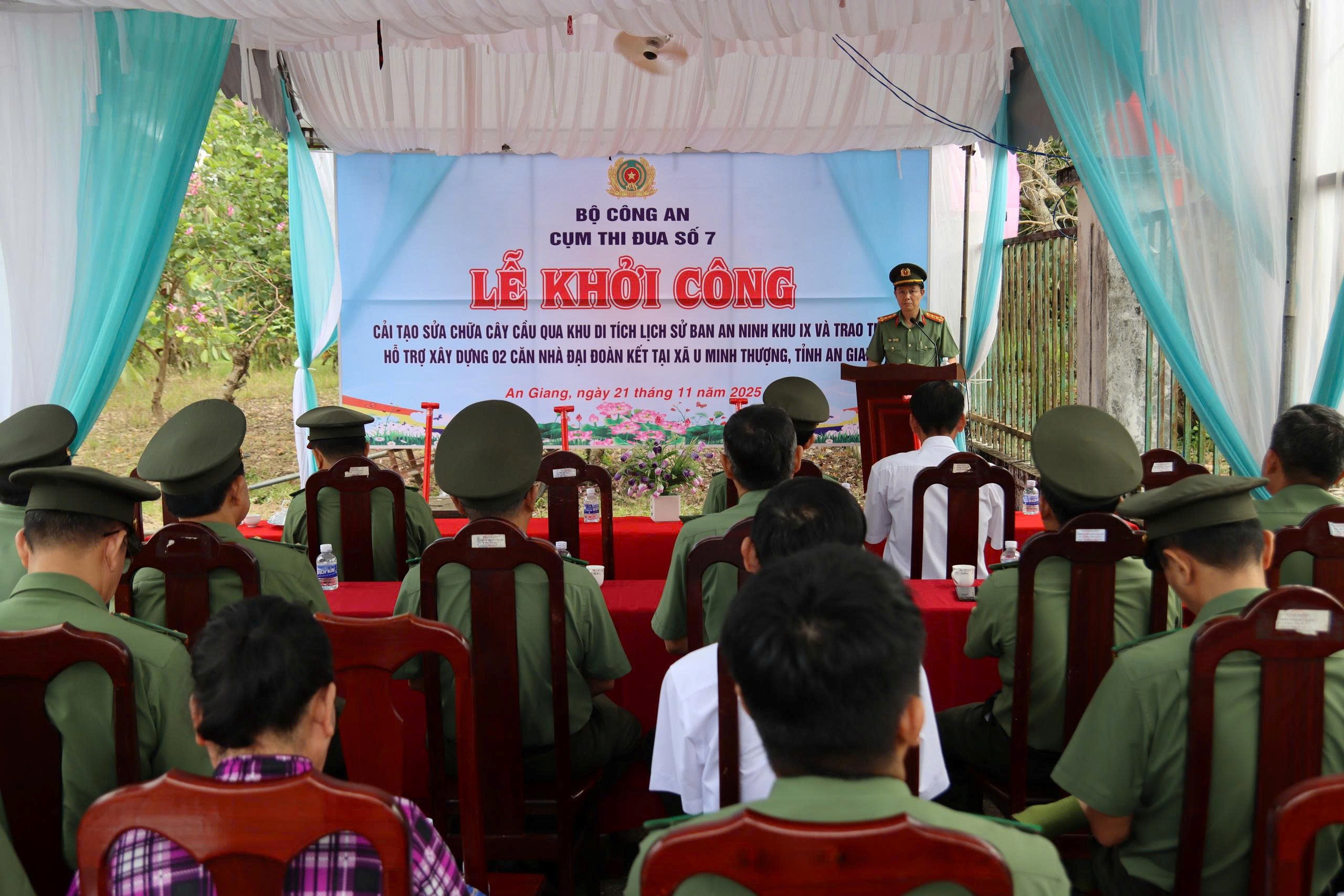 Sáng ngày 21/11/2025, Cụm thi đua số 7 – Bộ Công an gồm Công an các tỉnh: An Giang, Cà Mau, Vĩnh Long, Đồng Tháp và Tây Ninh do Công an tỉnh An Giang làm Cụm trưởng, tổ chức Lễ khởi công cải tạo sửa chữa cây cầu bắt qua Khu Di tích lịch sử Quốc gia Ban An ninh Khu IX và trao tiền hỗ trợ xây dựng 02 căn nhà Đại đoàn kết ở xã U Minh Thượng, tỉnh An Giang. Tham dự Lễ khởi công có Đại tá Lê Phú Thạnh, Tỉnh ủy viên, Phó Bí thư Đảng ủy, Phó Giám đốc Công an tỉnh An Giang; Đại tá Lê Tấn Vinh, Phó Giám đốc Công an tỉnh Cà Mau; Đại tá Phan Văn Triều, Phó Giám đốc Công an tỉnh Tây Ninh; cùng đại diện chính quyền và nhân dân xã U Minh Thượng tỉnh An Giang.