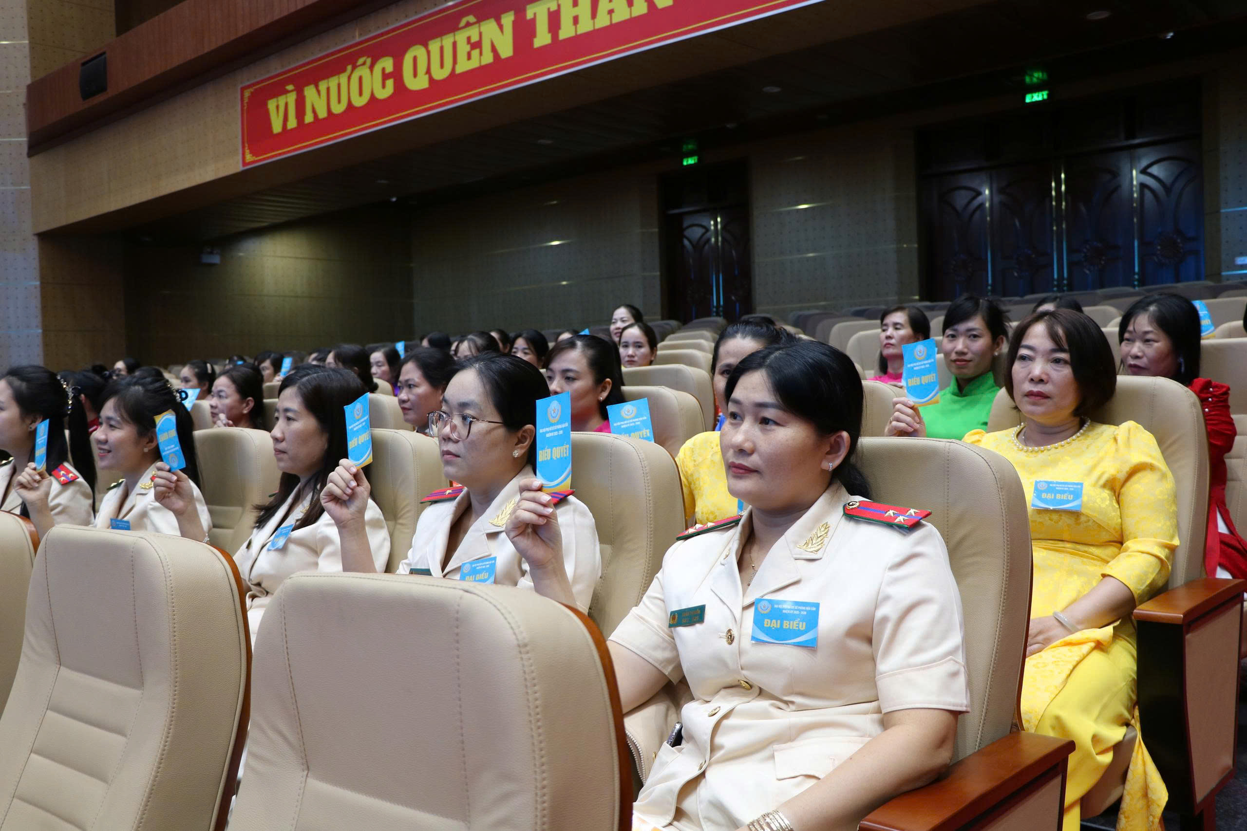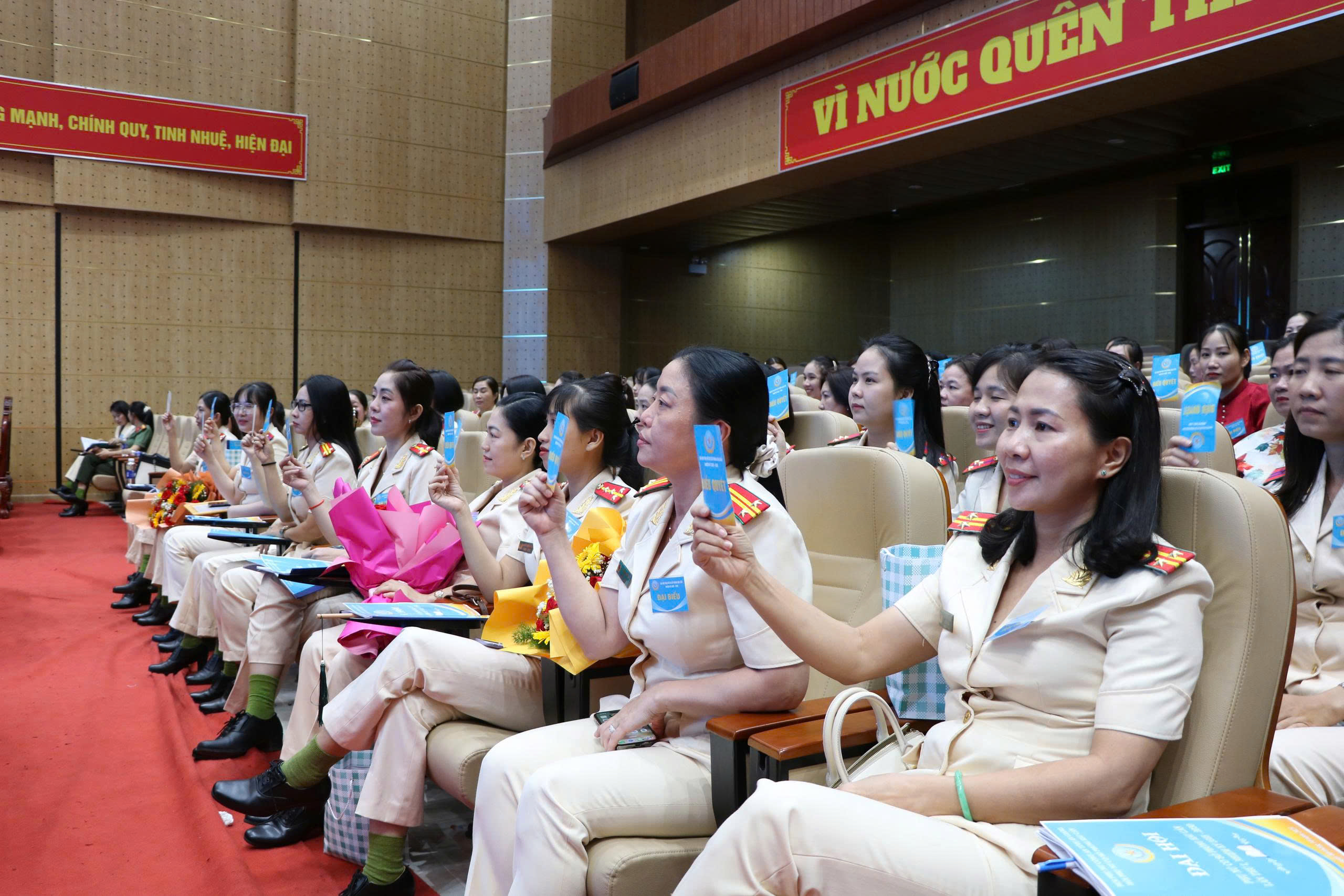 Các đại biểu tiến hành biểu quyết Nghị quyết Đại hội Hội phụ nữ cơ sở Phòng Hậu cần lần thứ I, nhiệm kỳ 2025 - 2030