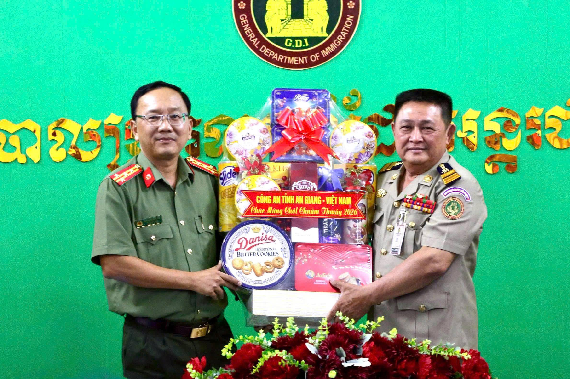 Tại nơi đến thăm, trong không khí thắm tình hữu nghị, đoàn công tác Công an tỉnh An Giang đã gửi những lời chúc mừng tốt đẹp nhất đến lãnh đạo, cán bộ, chiến sĩ Đồn Công an cửa khẩu Preck Chak nhân dịp năm mới Chôl Chnăm Thmây luôn dồi dào sức khỏe, hoàn thành tốt nhiệm vụ được giao, góp phần giữ vững an ninh, trật tự, vì cuộc sống bình yên của Nhân dân hai nước.