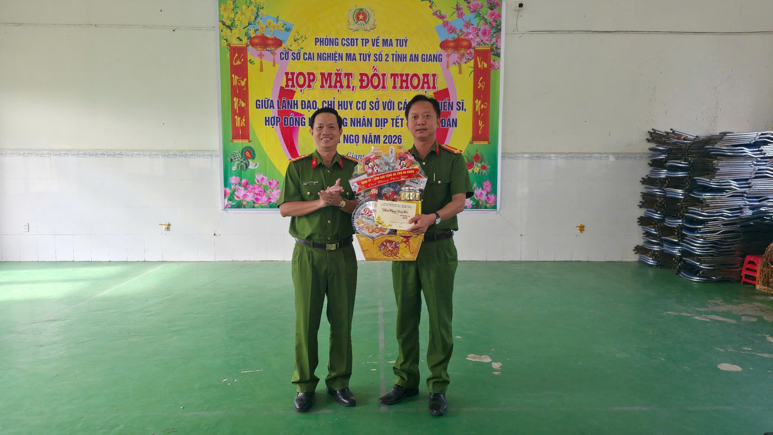 Nhân dịp Xuân mới Bính Ngọ 2026, đồng chí Phó Giám đốc Công an tỉnh đã trao quà Tết, gửi lời chúc mừng năm mới đến toàn thể cán bộ, chiến sỹ, người lao động và các học viên đang cai nghiện tại hai cơ sở; chúc mọi người đón Tết vui tươi, an lành, mạnh khỏe, hạnh phúc, đồng thời tin tưởng các học viên sẽ nỗ lực rèn luyện, quyết tâm từ bỏ ma túy, sớm trở về hòa nhập cộng đồng.