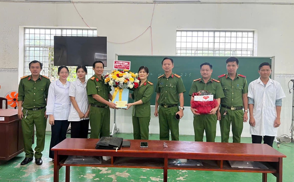 Thay mặt Đảng ủy, Ban Giám đốc Công an tỉnh, Đại tá Nguyễn Nhật Trường đã tặng lẵng hoa và quà cho đội ngũ Y Bác sĩ. Đồng chí chúc tập thể cán bộ Y tế luôn dồi dào sức khỏe, giữ vững bản lĩnh nghề nghiệp, tiếp tục là điểm tựa tin cậy giúp các học viên sớm vượt qua mặc cảm, đoạn tuyệt với ma túy để làm lại cuộc đời.