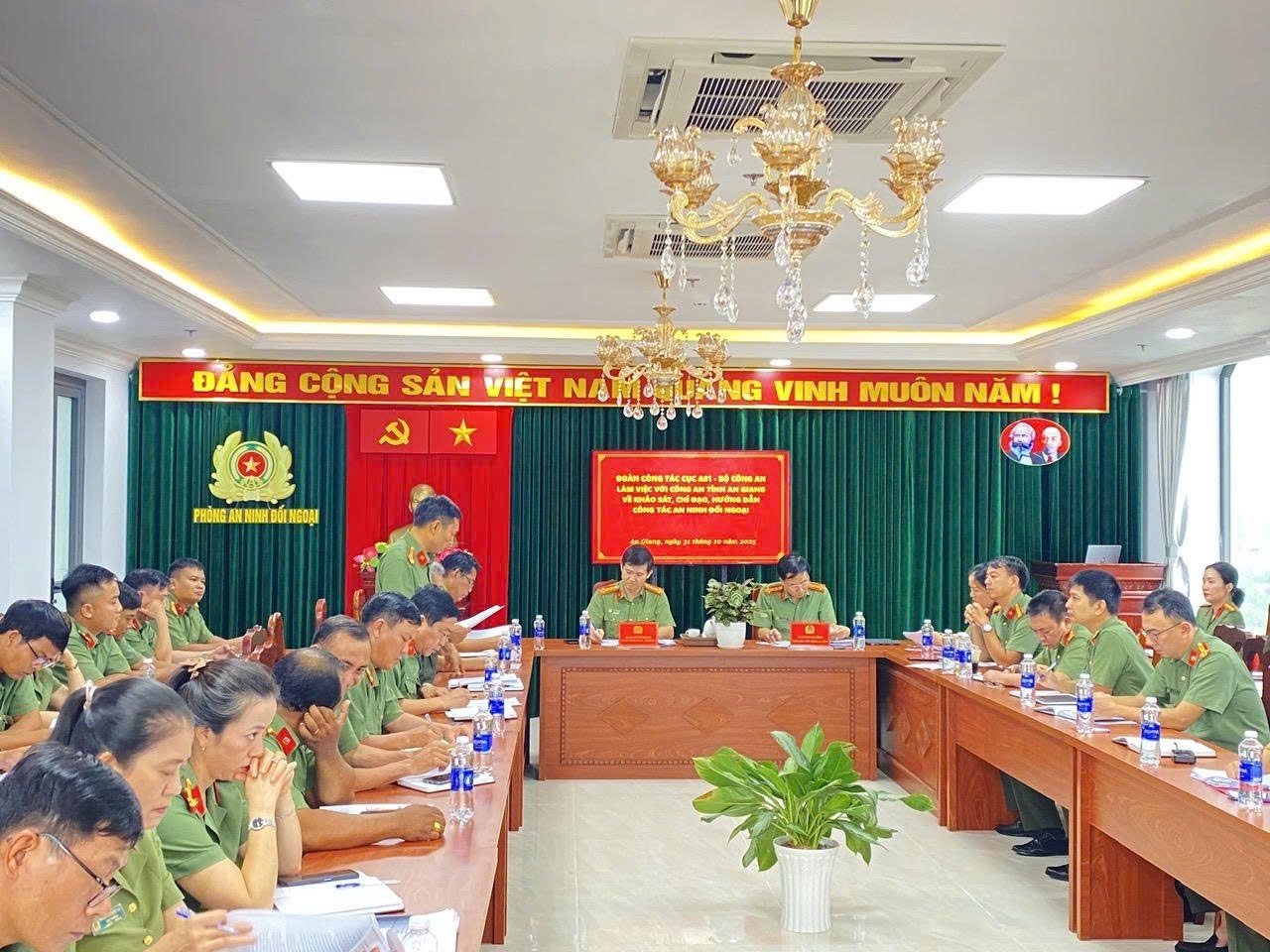 Ngày 31/10/2025, Công an tỉnh An Giang đã tiếp, làm việc với Đoàn công tác Cục An ninh đối ngoại, Bộ Công an khảo sát, chỉ đạo, hướng dẫn các mặt công tác đối với lực lượng An ninh đối ngoại.