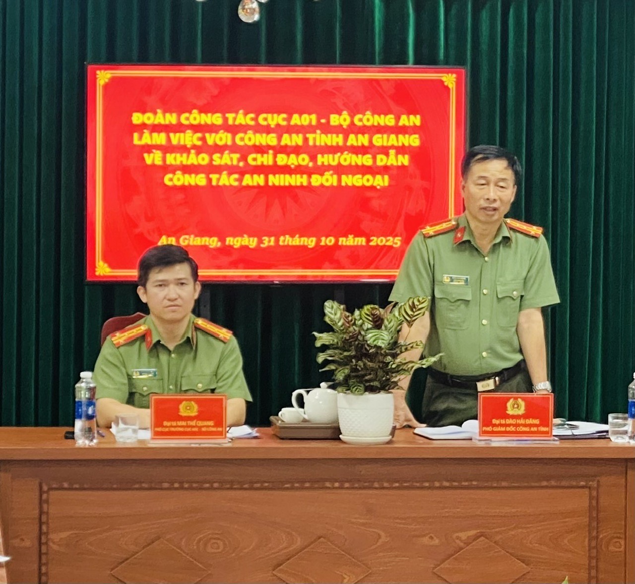 Tham dự buổi làm việc có đồng chí Đại tá Mai Thế Quang, Phó Cục trưởng Cục An ninh đối ngoại - Bộ Công an, Trưởng đoàn công tác; đồng chí Đại tá Đào Hải Đăng, Phó Giám đốc Công an tỉnh; lãnh đạo các Phòng Nghiệp vụ thuộc Cục An ninh đối ngoại; lãnh đạo - chỉ huy và toàn thể cán bộ chiến sĩ Phòng An ninh đối ngoại, Công an tỉnh An Giang.