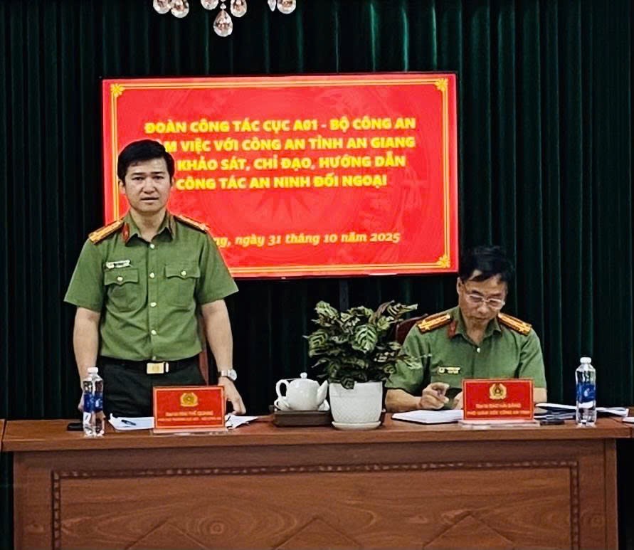 Phát biểu kết luận tại buổi làm việc, đồng chí Đại tá Mai Thế Quang đánh giá cao sự quan tâm lãnh đạo, chỉ đạo của Đảng ủy, Ban Giám đốc Công an tỉnh đối với công tác An ninh đối ngoại, nhất là trong bối cảnh thực hiện mô hình chính quyền địa phương hai cấp đang được triển khai. Đồng chí khẳng định, Công an tỉnh An Giang đã triển khai nghiêm túc, đồng bộ các văn bản chỉ đạo của Bộ Công an, góp phần bảo đảm vững chắc an ninh quốc gia. Bên cạnh đó, đồng chí cũng đề nghị mỗi cán bộ, chiến sĩ An ninh đối ngoại, Công an tỉnh phải không ngừng học tập, rèn luyện bản lĩnh chính trị, nâng cao trình độ chuyên môn, nghiệp vụ, góp phần xây dựng lực lượng An ninh đối ngoại thật sự trong sạch, vững mạnh, chính quy, tinh nhuệ, hiện đại đáp ứng yêu cầu nhiệm vụ trong tình hình mới.