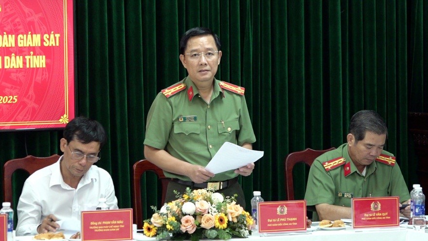Phát biểu tại buổi làm việc, đồng chí Đại tá Lê Phú Thạnh, Phó Bí thư Đảng uỷ, Phó Giám đốc Công an tỉnh cảm ơn những ý kiến đóng góp của Đoàn Giám sát, qua đó, đề nghị lãnh đạo các đơn vị nghiệp vụ liên quan nghiêm túc tiếp thu để kịp thời tham mưu Đảng ủy, Ban Giám đốc Công an tỉnh chỉ đạo Công an các đơn vị, địa phương tổ chức thực hiện có hiệu quả các mặt công tác trong thời gian tới. Đồng thời, đồng chí Phó Giám đốc ghi nhận và biểu dương tinh thần trách nhiệm và sự cố gắng nỗ lực của từng cán bộ, chiến sĩ trong công tác bảo vệ an ninh quốc gia, bảo đảm trật tự, an toàn xã hội, đặc biệt trong giai đoạn triển khai thực hiện mô hình chính quyền địa phương 02 cấp. Thời gian qua, Đảng ủy, Ban Giám đốc Công an tỉnh luôn đặc biệt quan tâm lãnh, chỉ đạo lực lượng Công an toàn tỉnh triển khai vận hành ngay tổ chức bộ máy theo chủ trương, chỉ đạo của Đảng ủy Công an Trung ương, Lãnh đạo Bộ Công an, Tỉnh uỷ, UBND tỉnh đảm bảo không bị ngắt quãng, gián đoạn và đặc biệt là bảo đảm tuyệt đối an ninh, trật tự ngay từ cơ sở phục vụ có hiệu quả việc sắp xếp, sáp nhập, hợp nhất đơn vị hành chính các cấp trên phạm vi toàn tỉnh.