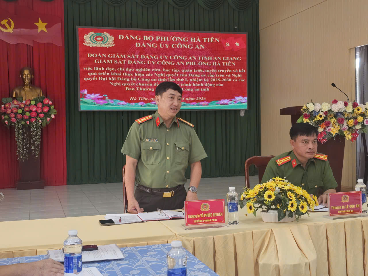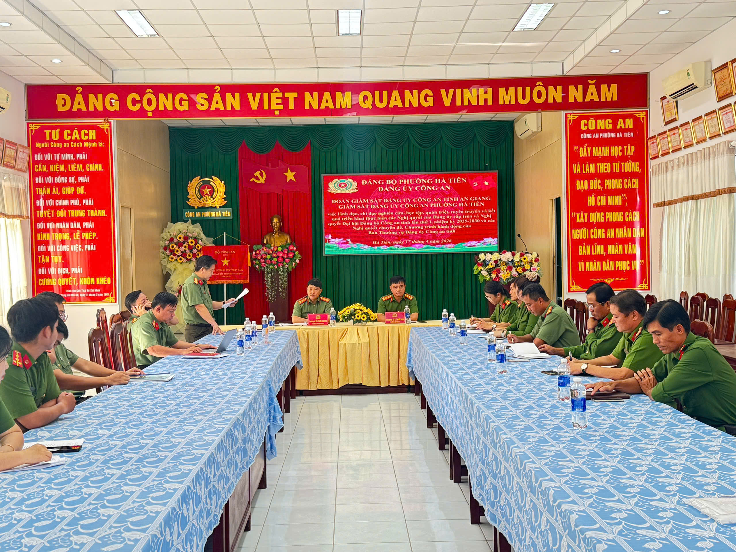 Ngày 17/4/2026, Đoàn Giám sát số 02 - Đảng ủy Công an tỉnh làm việc với Đảng bộ Công an phường Hà Tiên để tiến hành giám sát việc thực hiện nghiên cứu, học tập, quán triệt, tuyên truyền và kết quả thực hiện các Nghị quyết của Đảng ủy cấp trên, Nghị quyết Đại hội Đảng bộ Công an tỉnh lần thứ I, nhiệm kỳ 2025-2030 và các Nghị quyết chuyên đề, Chương trình hành động của Ban Thường vụ Đảng ủy Công an tỉnh.