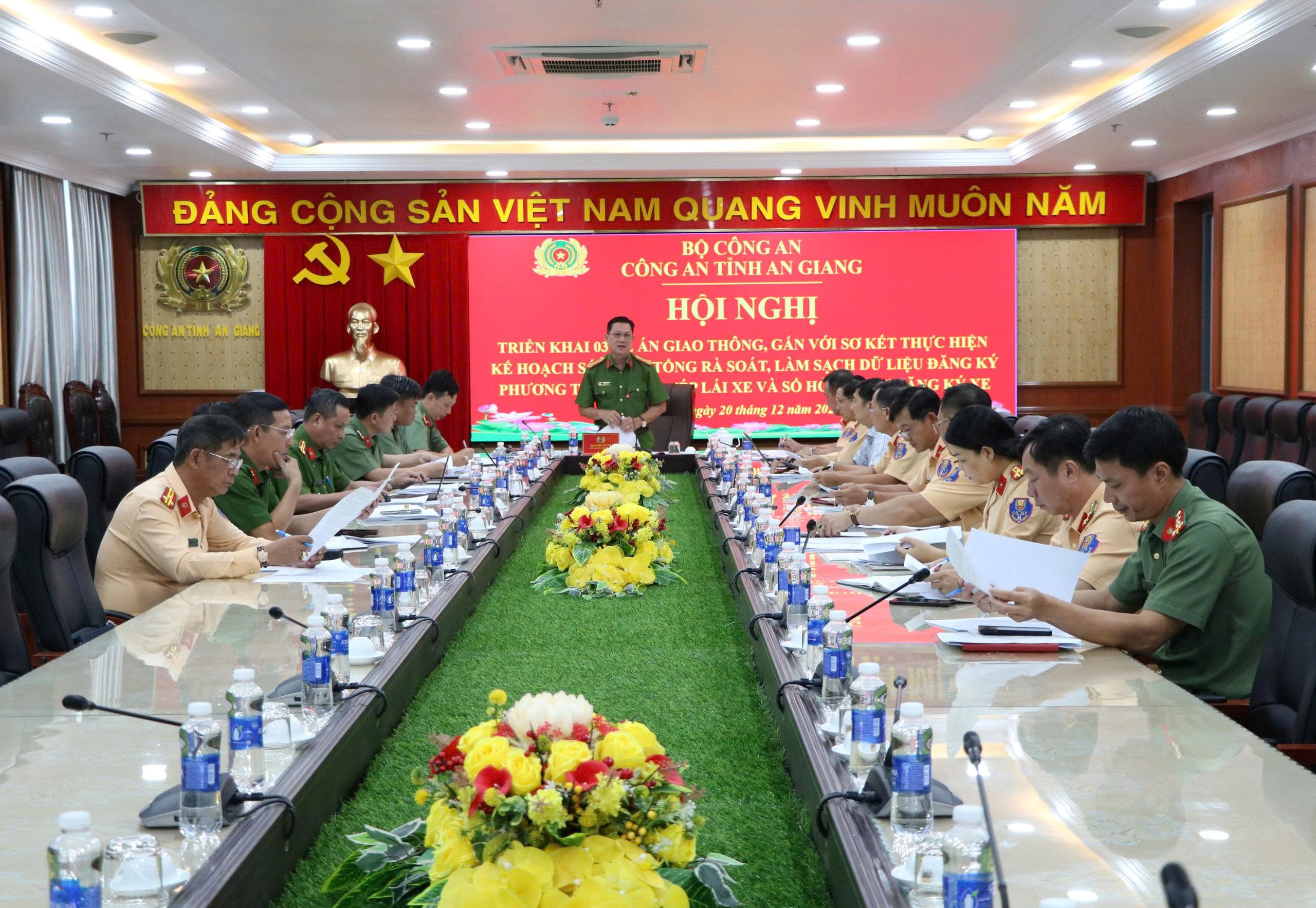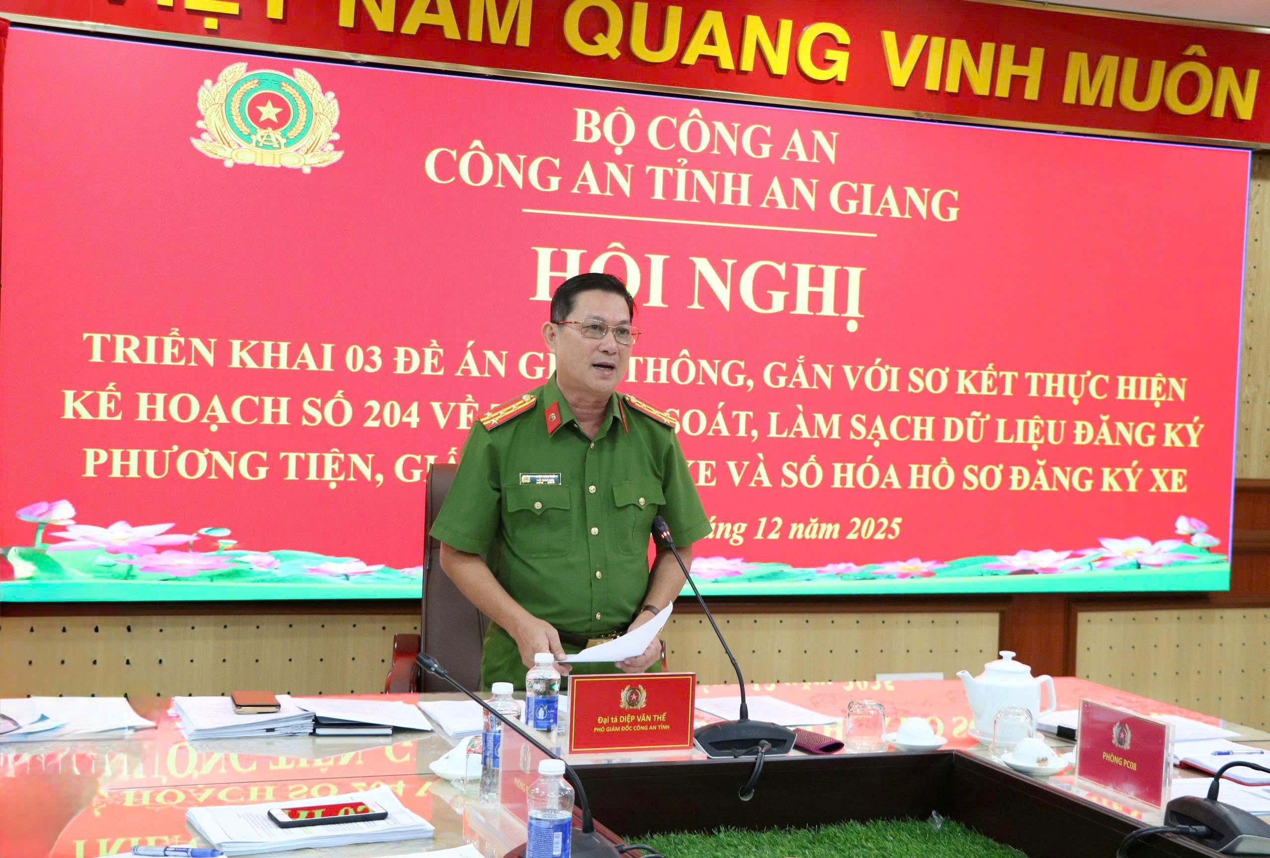 Nhằm triển khai đồng bộ các chủ trương lớn của Bộ Công an trong lĩnh vực trật tự, an toàn giao thông gắn với yêu cầu chuyển đổi số. Chiều ngày 20/12/2025 Công an tỉnh An Giang tổ chức Hội nghị trực tuyến triển khai 03 Đề án giao thông, kết hợp sơ kết thực hiện Kế hoạch số 204 về tổng rà soát, làm sạch dữ liệu đăng ký phương tiện, giấy phép lái xe và số hoá hồ sơ đăng ký xe trên địa bàn tỉnh.