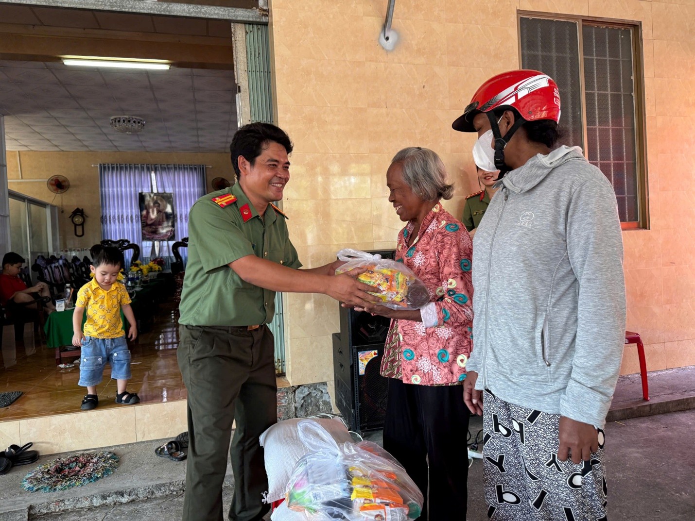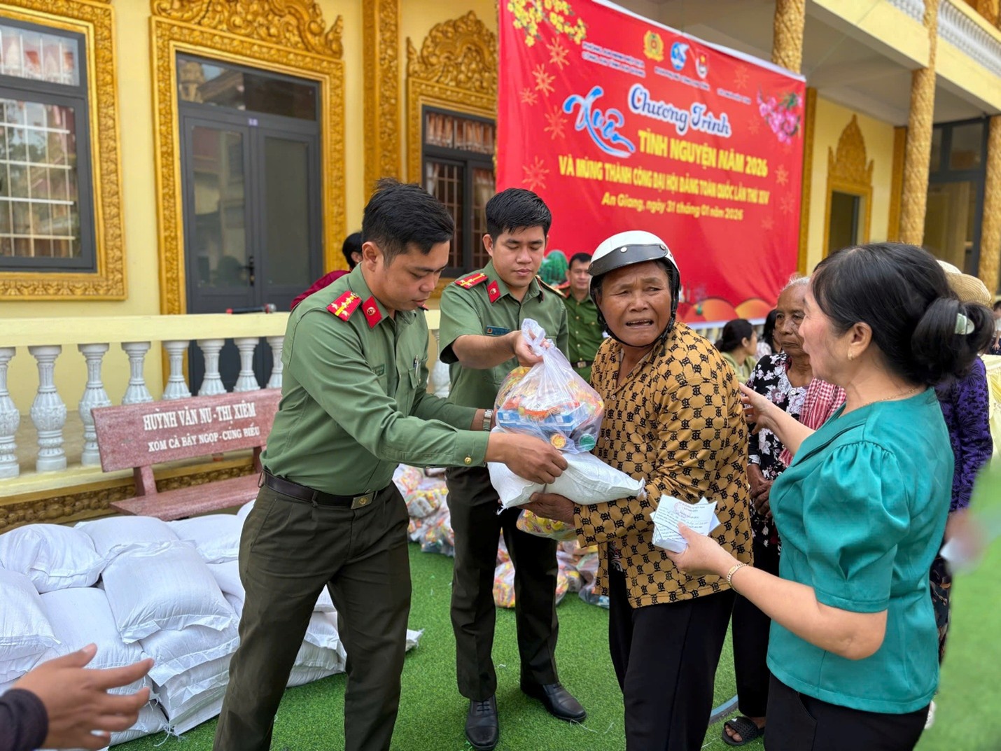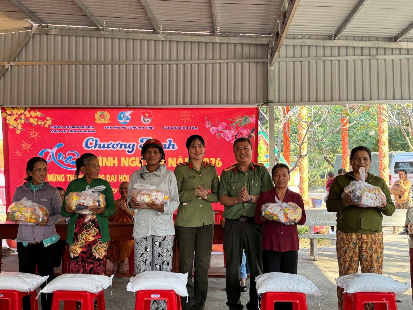 Tại chương trình, đã trao tặng 300 suất quà gồm các nhu yếu phẩm cho các hộ gia đình có hoàn cảnh khó khăn, đồng bào dân tộc thiểu số và lực lượng tham gia bảo vệ an ninh, trật tự ở cơ sở trong dịp Tết Nguyên đán Bính Ngọ năm 2026 với tổng kinh phí thực hiện trên 90 triệu đồng được vận động từ các mạnh thường quân. Theo đó, tại chùa Sóc Xoài, xã Mỹ Thuận, đoàn công tác đã trao 125 phần quà cho người dân có hoàn cảnh khó khăn, đồng bào dân tộc thiểu số của xã Mỹ Thuận, xã Sơn Kiên và trao 25 phần quà hỗ trợ bếp ăn của Trường Trung cấp Phật học Nam tông Khmer (chùa Sóc Xoài). Tại chùa Ba Trại, xã Kiên Lương, 150 phần quà được trao cho các hộ gia đình khó khăn và lực lượng tham gia bảo vệ an ninh, trật tự ở cơ sở trên địa bàn xã.