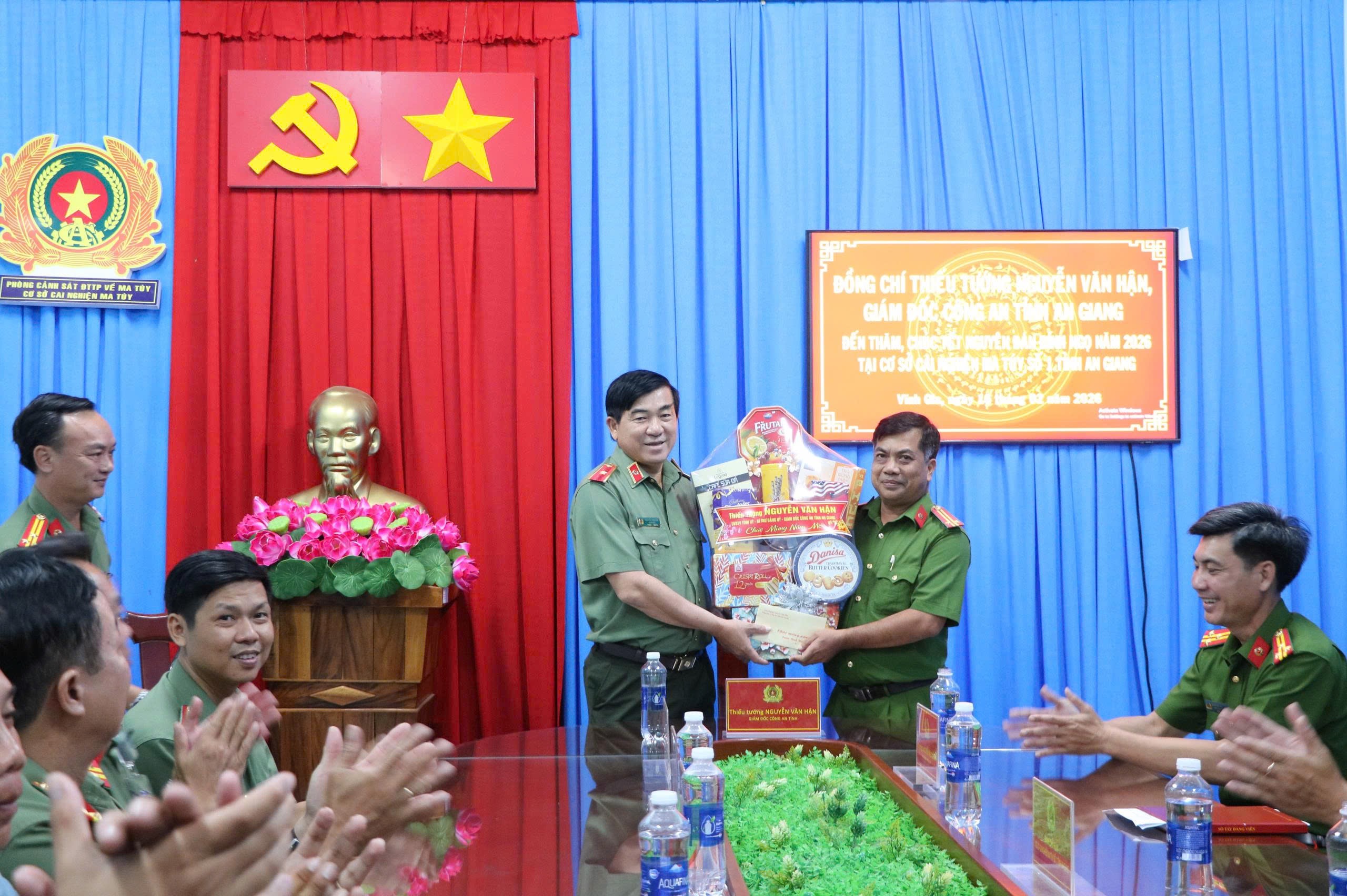 Nhân dịp Tết Nguyên đán Bính Ngọ năm 2026, tối ngày 16/2/2026 (đêm 29 Tết), Đoàn công tác của Công an tỉnh An Giang do đồng chí Nguyễn Văn Hận, Thiếu tướng, Ủy viên Ban Thường vụ Tỉnh ủy, Bí thư Đảng ủy, Giám đốc Công an tỉnh làm Trưởng đoàn đã đến thăm, chúc Tết và tặng quà cán bộ, chiến sĩ đang làm nhiệm vụ tại Cơ sở cai nghiện ma tuý số 1; Cơ sở cai nghiện ma tuý số 2 và Chốt bảo vệ mục tiêu Công an tỉnh (thuộc Phòng Cảnh sát cơ động).