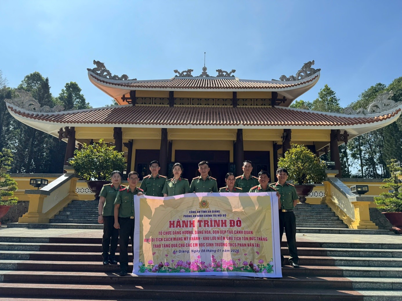 ‎Ngày 08/01/2026, tại Khu di tích cách mạng Mỹ Khánh (phường Bình Đức) và Khu lưu niệm Chủ tịch Tôn Đức Thắng (xã Mỹ Hòa Hưng), Phòng An ninh chính trị nội bộ Công an tỉnh An Giang đã tổ chức đợt sinh hoạt chính trị về nguồn, hướng tới chào mừng Đại hội Đảng bộ tỉnh An Giang lần thứ I, tiến tới Đại hội đại biểu toàn quốc lần thứ XIV của Đảng; đồng thời hưởng ứng phong trào thi đua “Ba nhất: Kỷ luật nhất – Trung thành nhất – Gần dân nhất” và chương trình Xuân tình nguyện năm 2026.