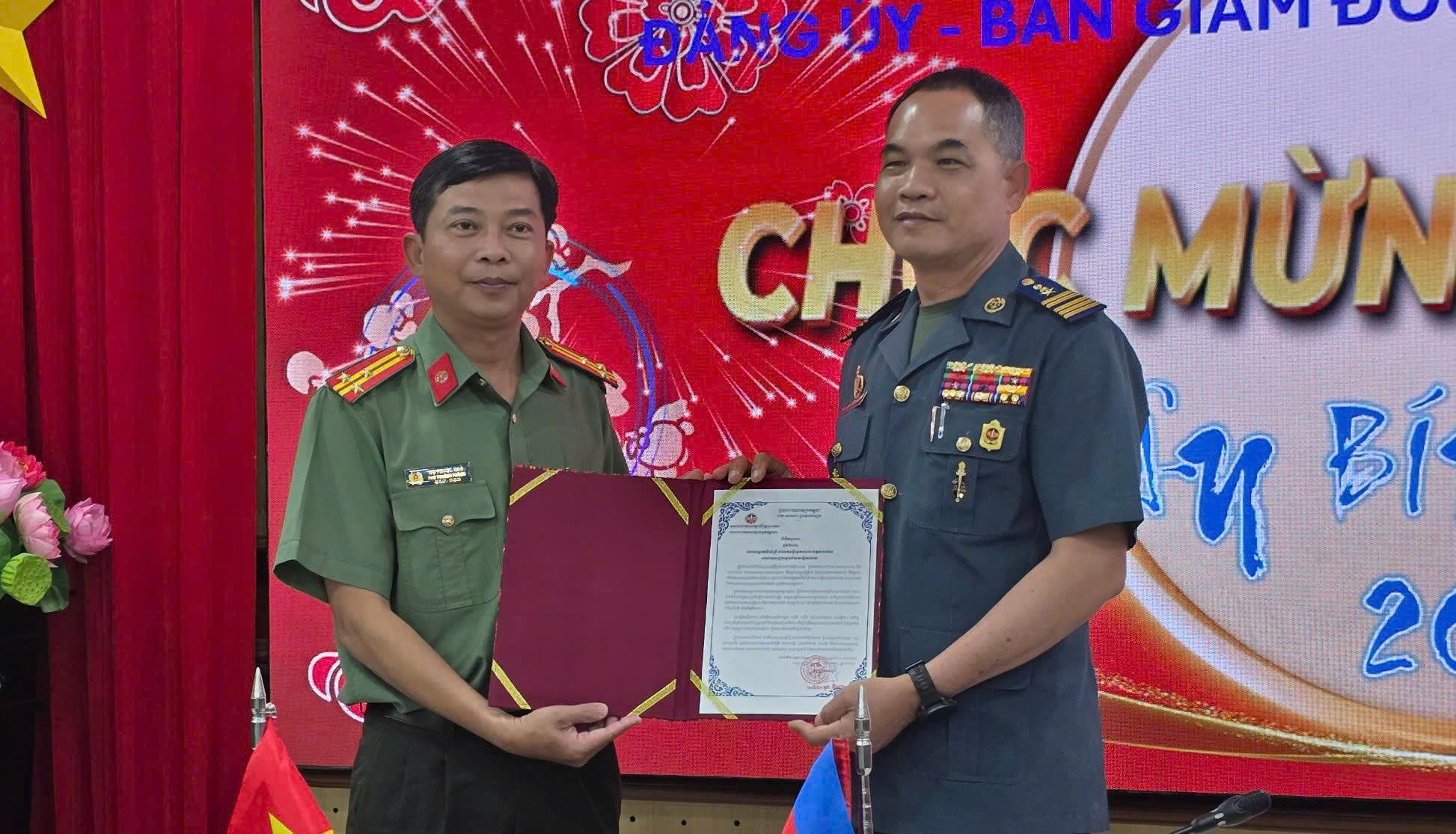 Đại tá Touch Y Nam – Phó Chỉ huy trưởng Hiến binh tỉnh KamPot (Vương quốc Campuchia) trao thư chúc Tết Công an tỉnh An Giang