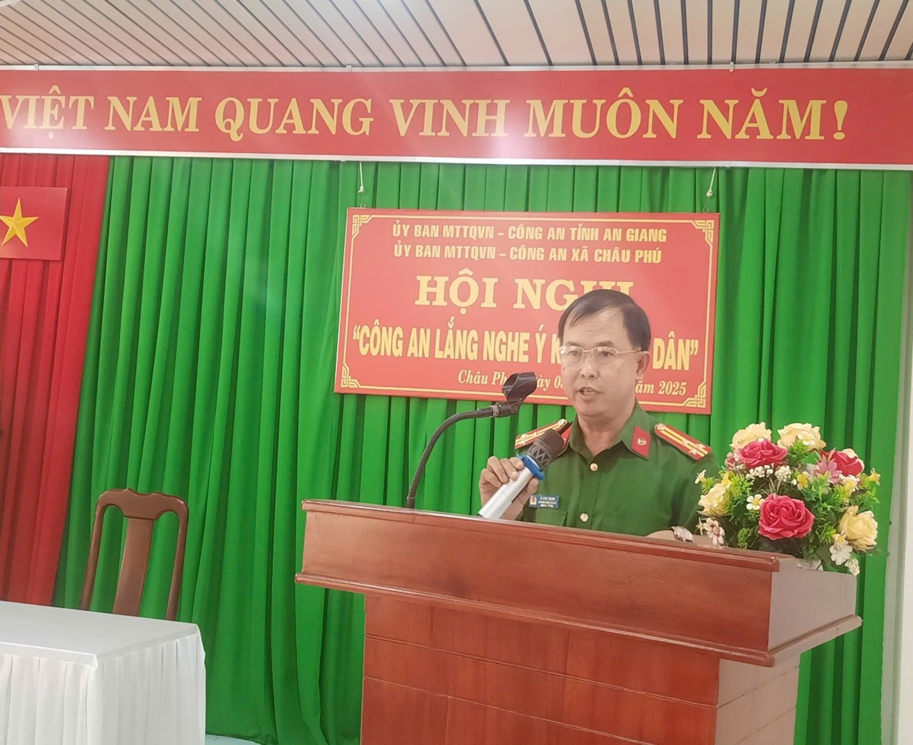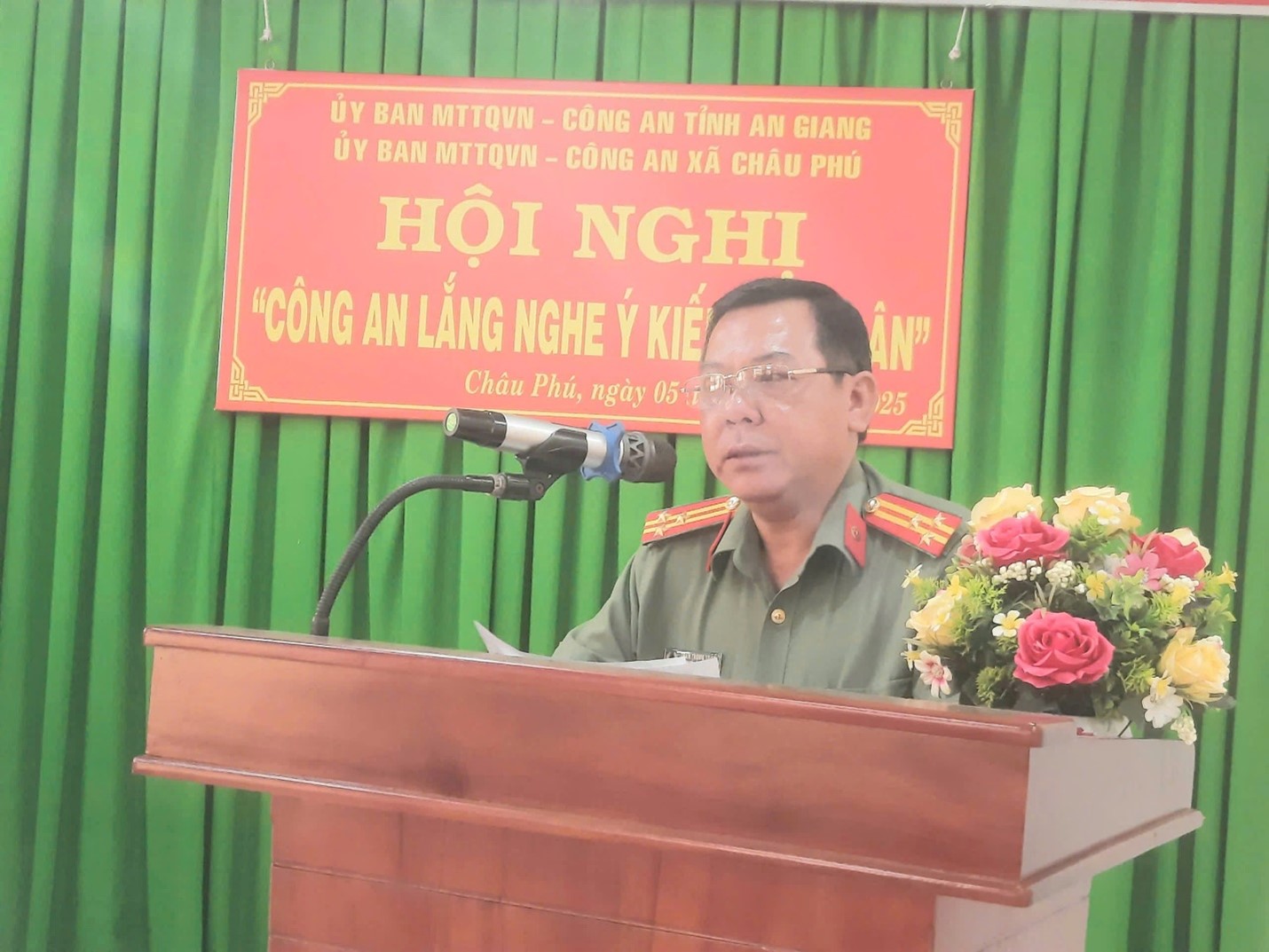 Vừa qua, Công an xã kết hợp Ủy ban Mặt trận Tổ quốc Việt Nam xã Châu Phú tổ chức Hội nghị “Công an lắng nghe ý kiến nhân dân” năm 2025. Tham dự Hội nghị có đại diện lãnh đạo các phòng nghiệp vụ Công an tỉnh phụ trách xã Châu Phú, đại diện Đảng ủy, UBND xã; đại diện Ủy ban MTTQ xã và Công an xã Châu Phú.